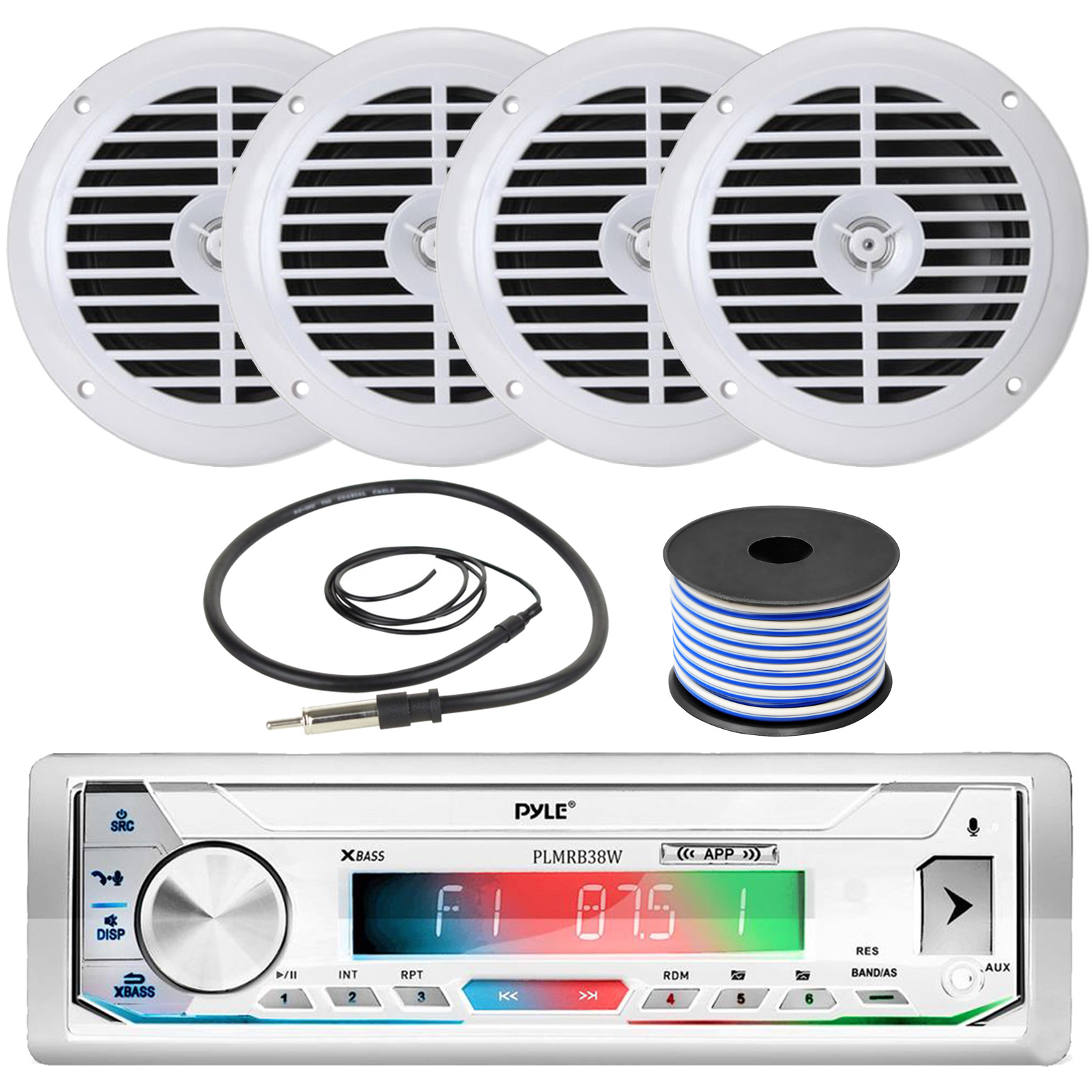 Pyle PLMRB39W Bluetooth Boat Stereo, 4x 6.5'' 120W White Speakers, Antenna, Wire