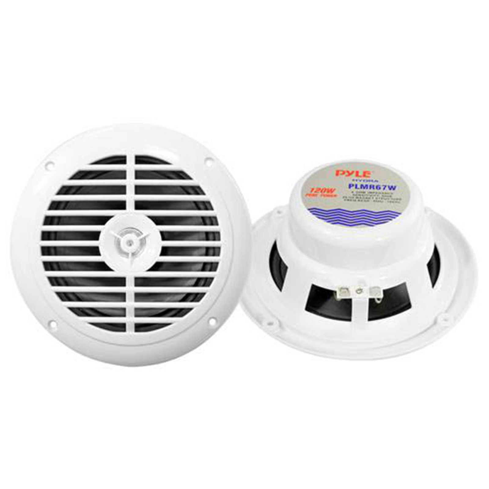 SPEAKER SYSTEM: These Pyle PLMR67W speakers are marine rated and can also be used in your car or off-road vehicle. They come in a white finish for added sleekness. They pack 120-Watts of max power, a polypropylene cone, and cloth surrounds. They are great replacement speakers for any vehicle.