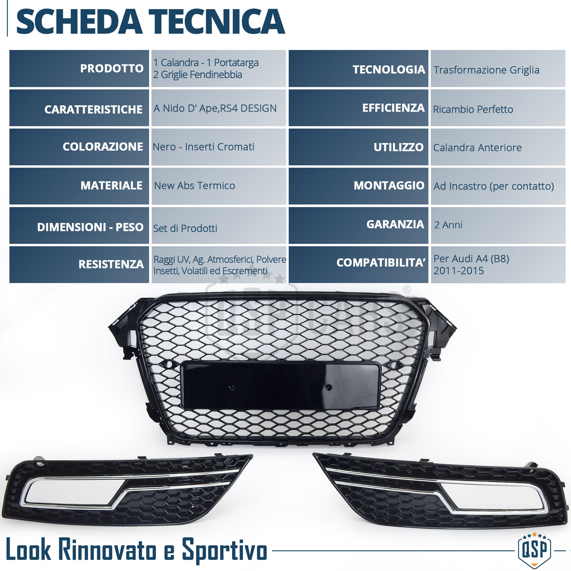 Set 1 CALANDRA ANTERIORE + 2 GRIGLIE FENDINEBBIA PARAURTI per AUDI A4 RS4 B8 Restyling (11-15), in Abs Nero Lucido, a Nido d' Ape.