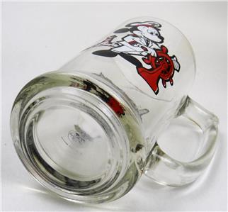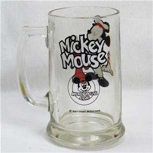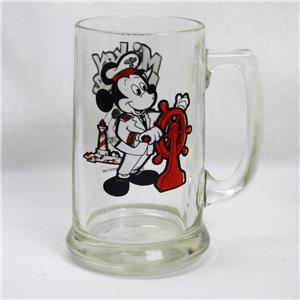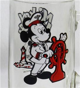 This clear glass (root) beer mug has Sailor Mickey Mouse in full uniform at the wheel of his ship, with a lighthouse in the background. On the other side of the mug is Mickey Mouse and the Mickey Mouse Club logo. It is copyright Walt Disney Productions.