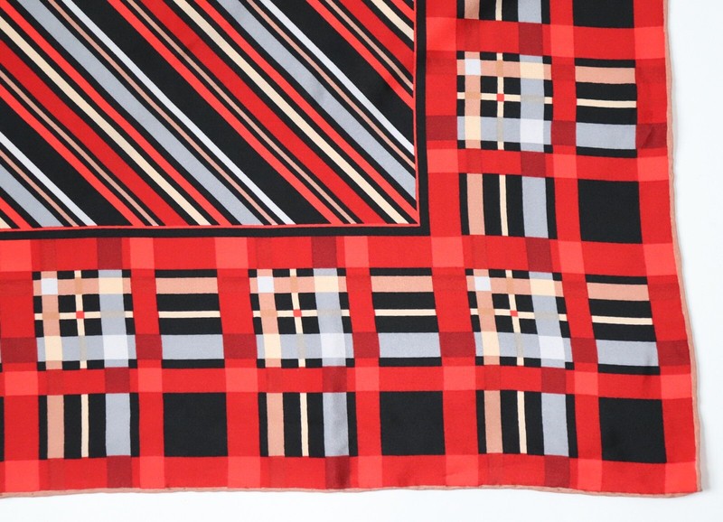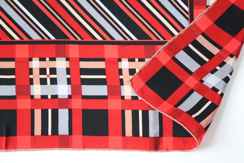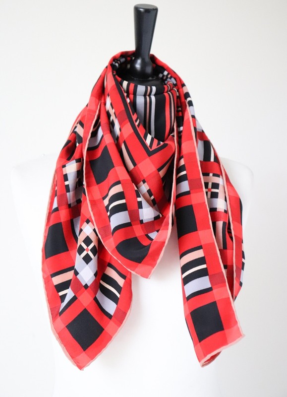Vintage crepe silk scarf in black, red and nude brown with a checked border and striped centre,