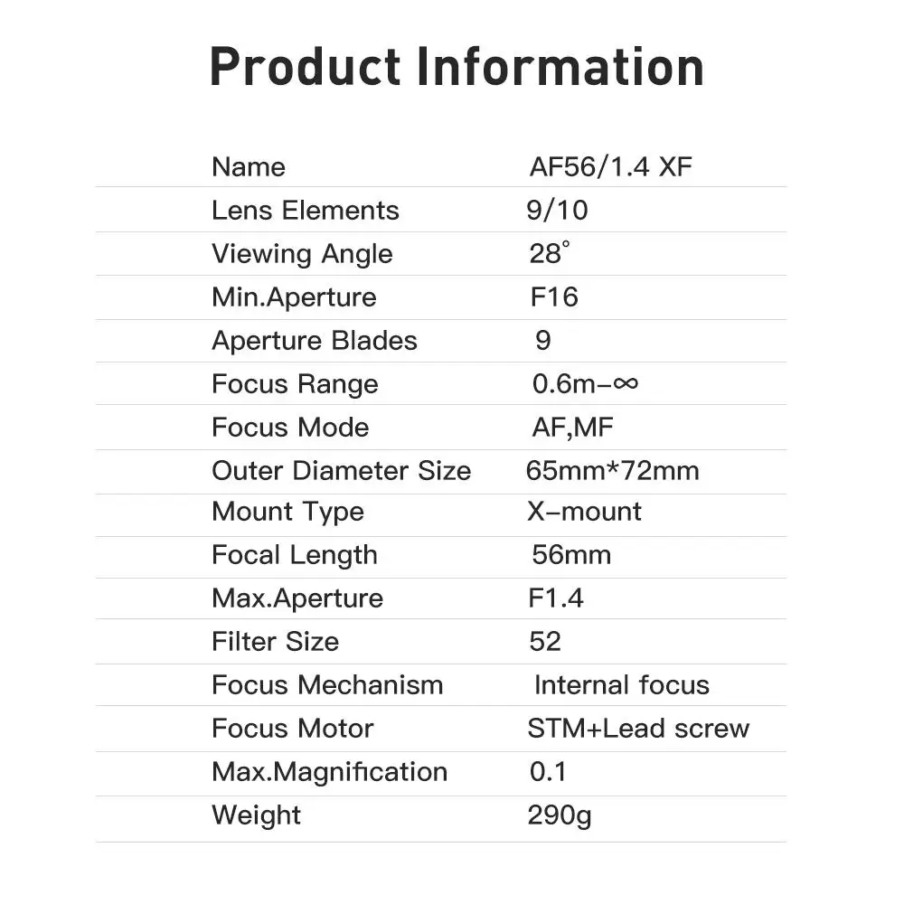 1 x VILTROX AF 56/1.4 XF Lens 1 x Lens Hood 1 x Front Lens Cap 1 x Back Lens Cap 1 x User Manual