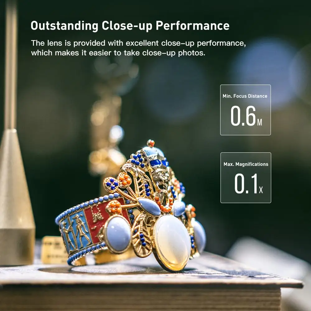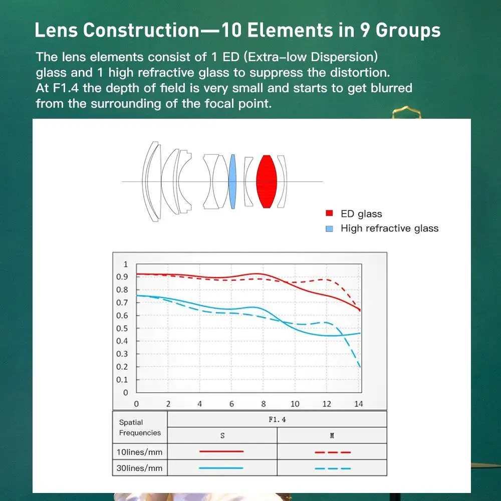 ·Full Frame, 56mm focal length, F1.4 large aperture. ·Support Auto Focus,Electronic Aperture,internal focus structure ·Noiseless STM focus motor,focus is sensitive. ·10 elements in 9 groups,including 1 ED lens and 2 high refractive index lens. ·HD Nano multilayer coating with water-resistant and antifouling coating. ·Precision brass bayonet and durable. ·Support camera multiple shooting modes,EXIF information record