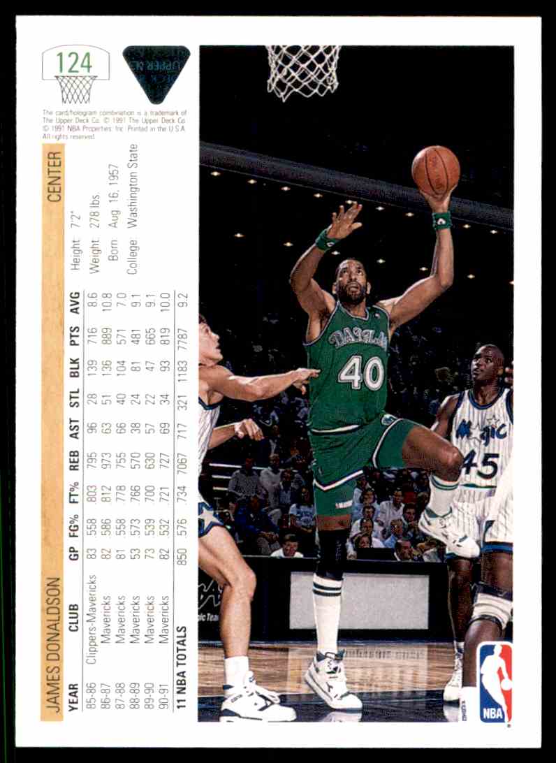 | Description: | James Donaldson | | Category: | Basketball | | Year: | 1991 | | Product: | Upper Deck | | Card Number: | 124 | | Dimensions: | 3½" x 2½" |
