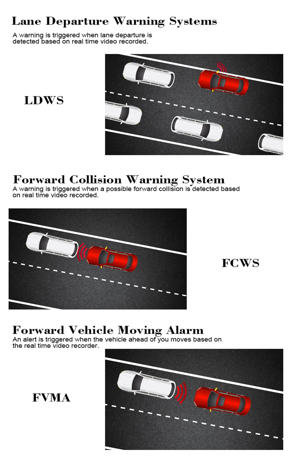 FVMA Forward Vehicle Moving Alarm An alert is triggered when the vehicle ahead of you moves based on the real time video recorder.