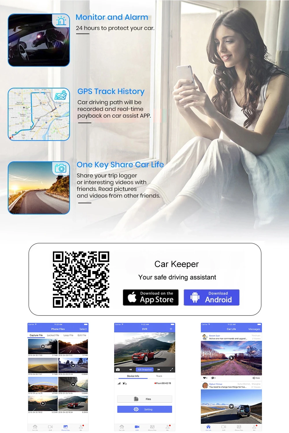 Track your car's location and capture your car's situation remotely from anywhere in the world. Once connected to the Internet, you can use the Mobile App to view your viewed images and watch videos recorded by your device.