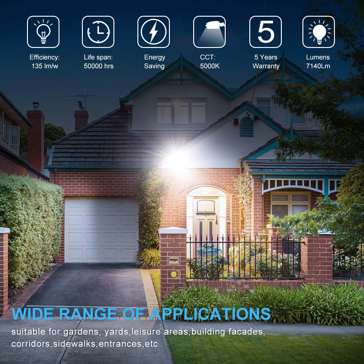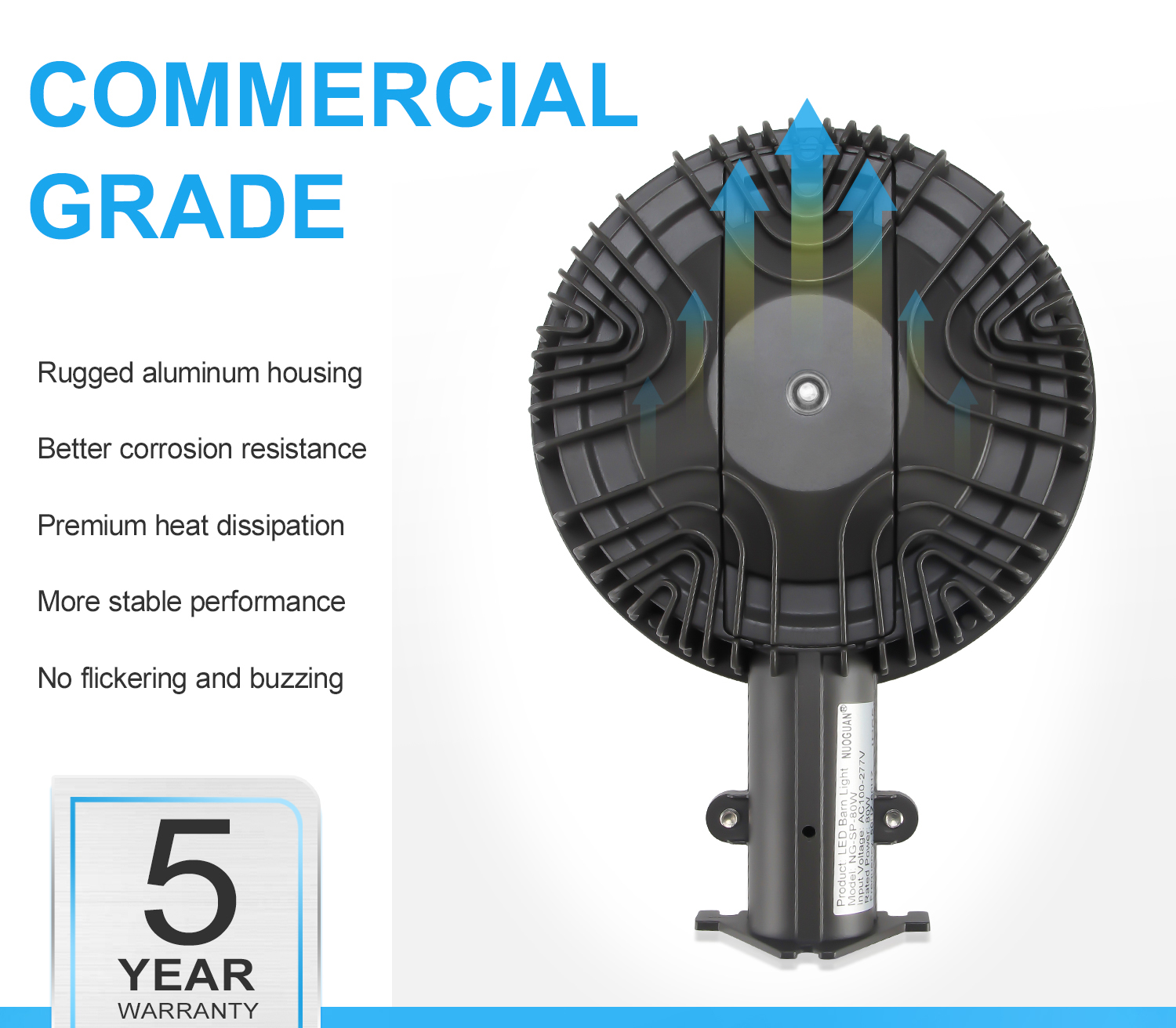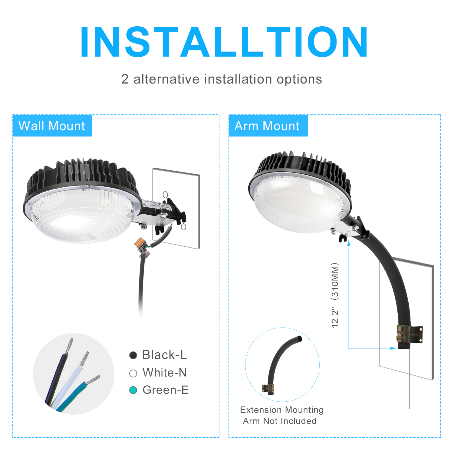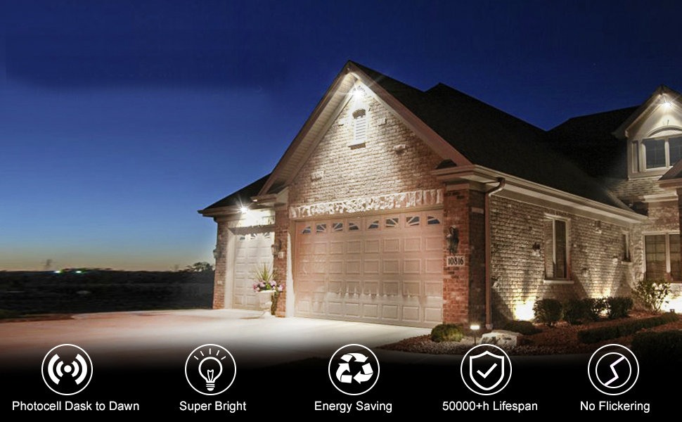 ⭐ Dusk-to-Dawn photocell included: The Sensor Outdoor Wall Mount Security Lights Built in photocell, Turn on as dusk falls and powers off automatically when daylight returns ⭐ More BRIGHTER, more SAFER---With bright SMD LED chips, 120LM/W brightness for outdoor activates in a dark environment, IP65 Dust-proof and Waterproof for outdoor applications ⭐EASY INSTALLATION OPTIONS: Mount to a wall or other sturdy, flat surface OR secure stainless steel clamps to a mounting tube(Kindly NOTE: Pole Arm is not included), Widely used in indoor outdoor applications, such as garden, porch, backyard, barns, Storage room, Equipment room, Walkways, Roadway, Back Door Entrance, patios, pathways, farms, parking lots, garages and Alleyways. Works as yard light, outdoor street light, area light, security light, barn light and perimeter Lighting ⭐5 Years Warranty---NUOGUAN claims 5 Years Warranty for these outdoor led yard light, contact us to get support if any issues or concerns