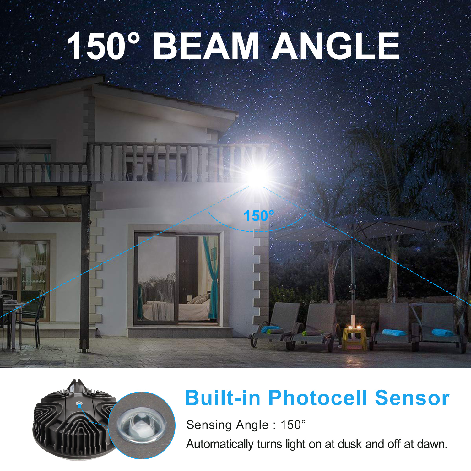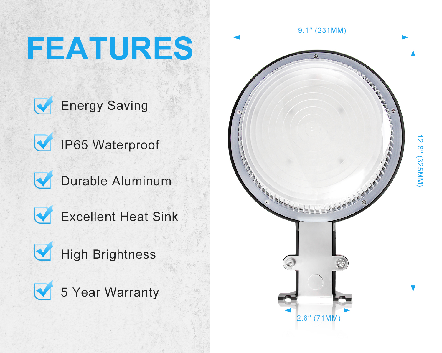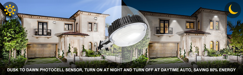FEATURES Perfectly replace your traditional barn light with larger coverage Dusk to dawn feature, auto-on at dusk and auto-off at dawn, saving cost and energy Heavy Duty-Rugged aluminum housing ensures excellent corrosion resistance and heat dissipation