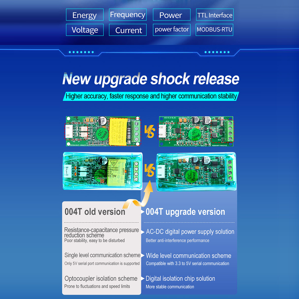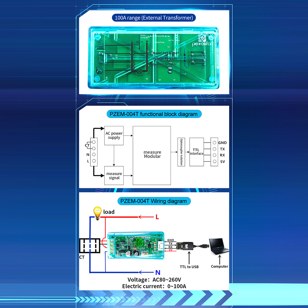 This document describes the specification of the PZEM-004T AC communication module, the module is mainly used for measuring AC voltage, current, active power, frequency, power factor and active energy, the module is without display function, the data is read through the TTL interface.