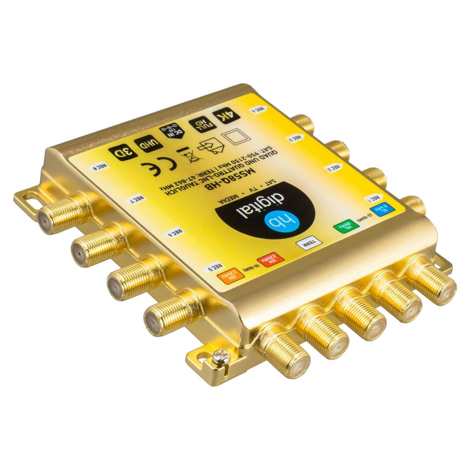 Der Multischalter wird von einem mitgelieferten externen Netzteil betrieben. Dank der externen Stromversorgung werden die Satelliten-Signale verstärkt.