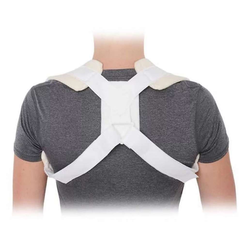 These braces are typically designed in a figure-eight style, with padded straps that wrap around the shoulders and meet in the middle of the back to gently pull the shoulders back into proper alignment.