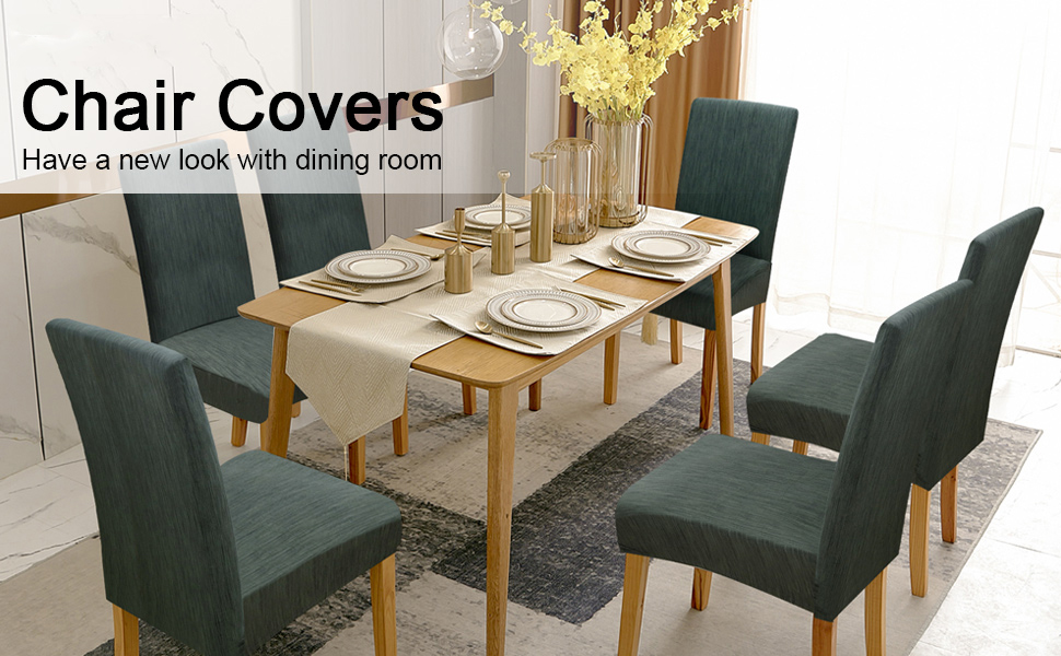 Fit PerfectlyStretchable dining chair slip cover is designed with curved corners make its contour match the shape of the chair, perfectly fit for most standard armless parsons and dining chairs. | Excellent StretchThese chair covers are made from a blend of polyester and spandex fabric, soft-touch, so comfortable and wrinkle resistant, long-lasting durability and easy maintenance. | Elastic BandStretchy fabric with all-around and sewn-in elastic cord in the bottom, convenient to install, perfectly fix the seat cover on the chair and stay in place. |