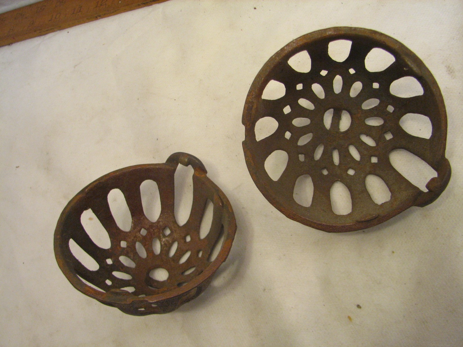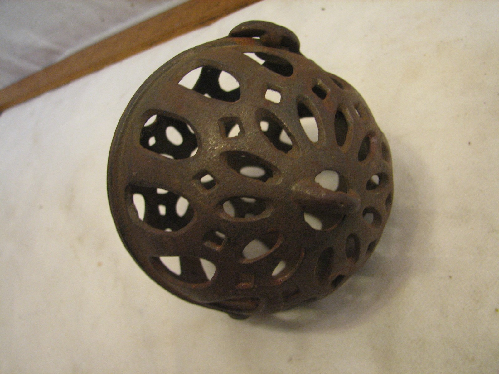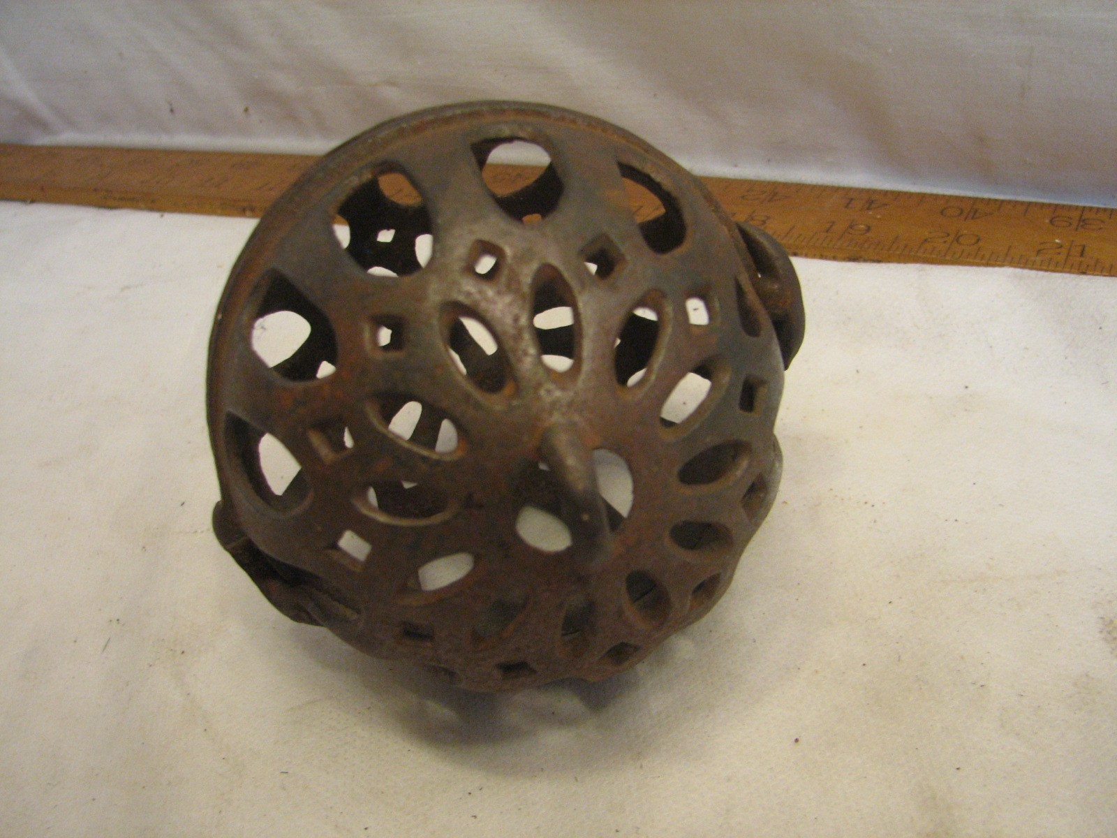Item Description A neat early cast iron string ball holder. Not sure of the maker. In overall good used condition with minor wear. Has a loop at either end and would likely have been hung for easy access. Measures about 3-3/4 inches across each half and this is about 4 " end to end.