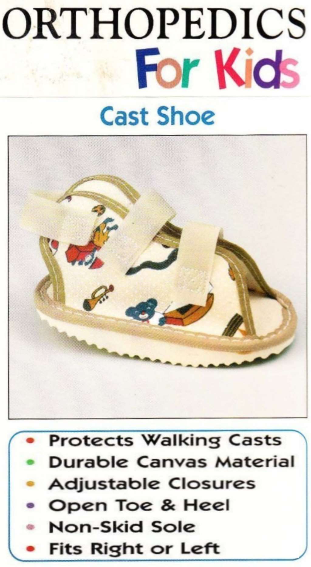 Latex free and free of metal buckles. Fits either right or left foot. Typically fits infants 0-24 months old and measures 5 1/2" x 3". One infant cast shoe per package.