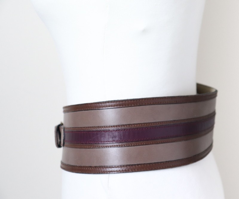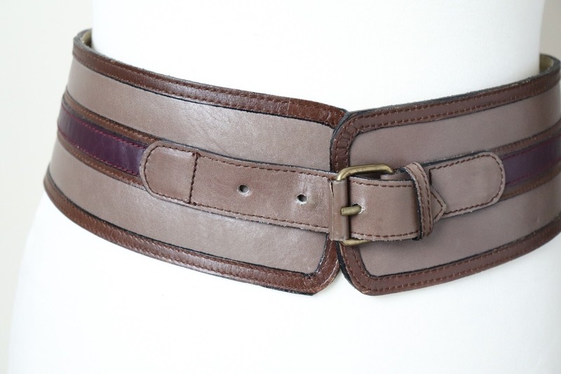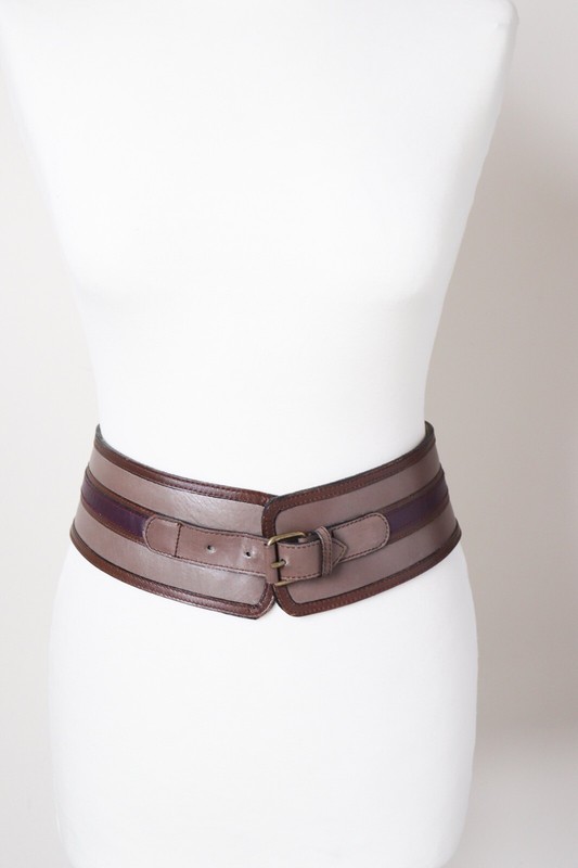 Wide leather corset belt in mushroom brown, trimmed with purple and dark brown.