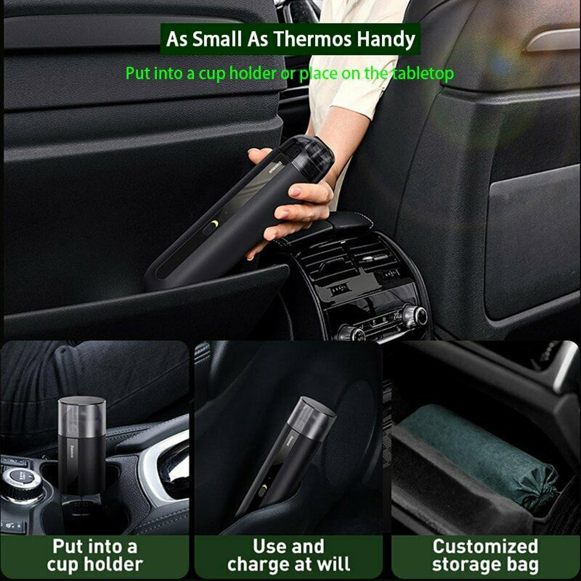 (2) As Small As Thermos Hand: Put into a cup holder / Use and charge at will / Customized storage bag