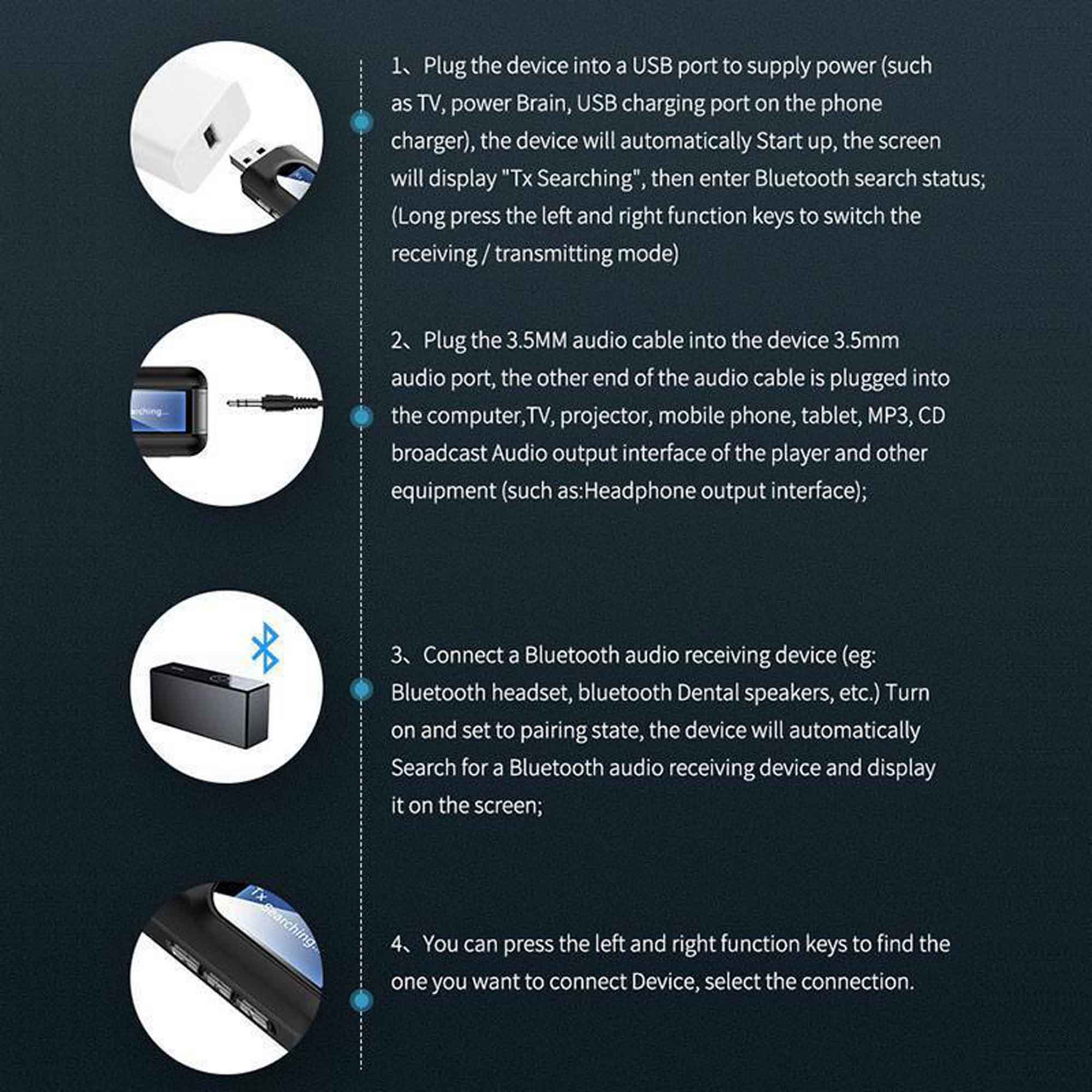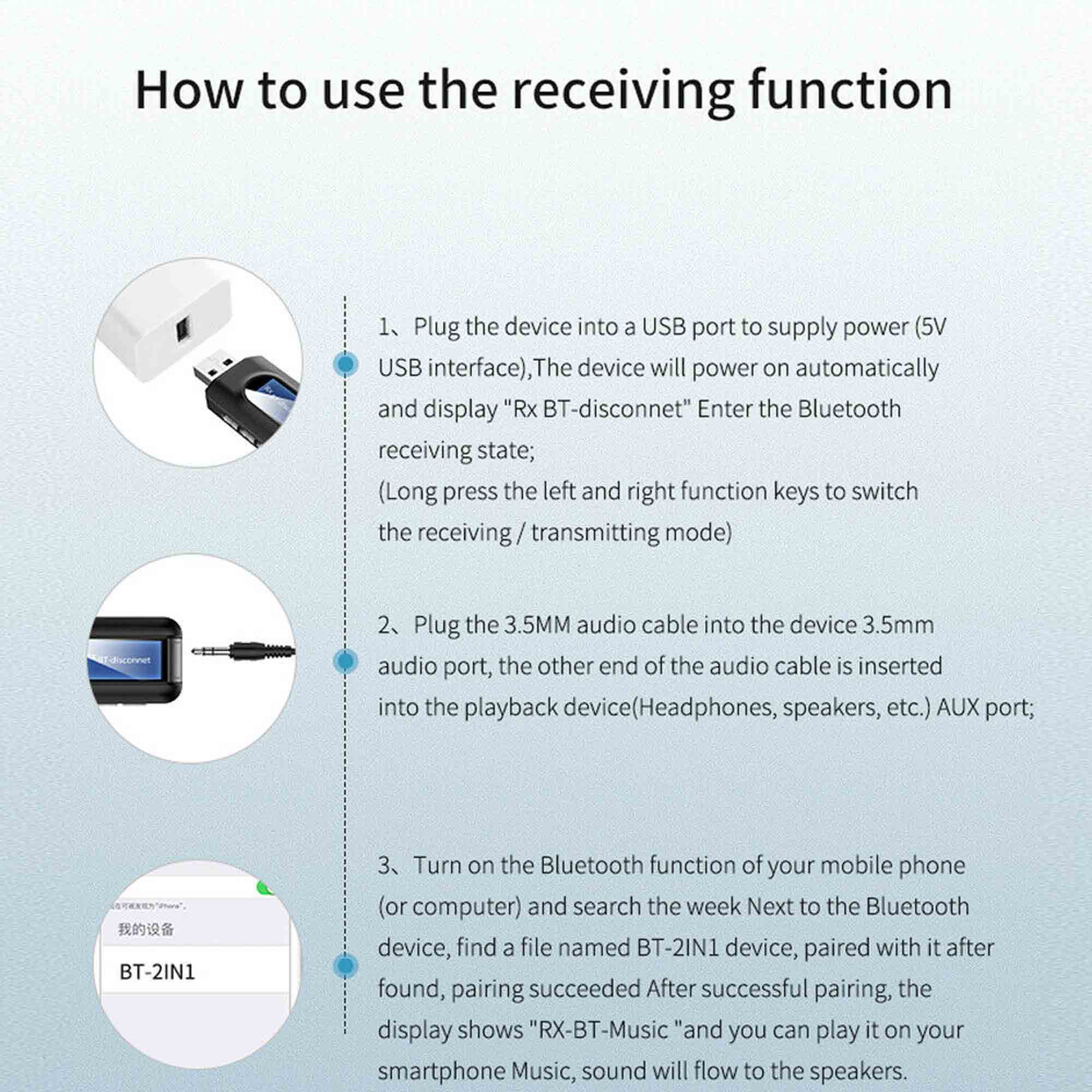 Modes: Transmitter Mode: The new upgrade adds an LCD display, which can simultaneously search and display 8 nearby Bluetooth devices for you to connect, more intuitive and convenient to use. Receiving Mode: In the receiving mode, you can adjust the volume, play up and down songs, etc.