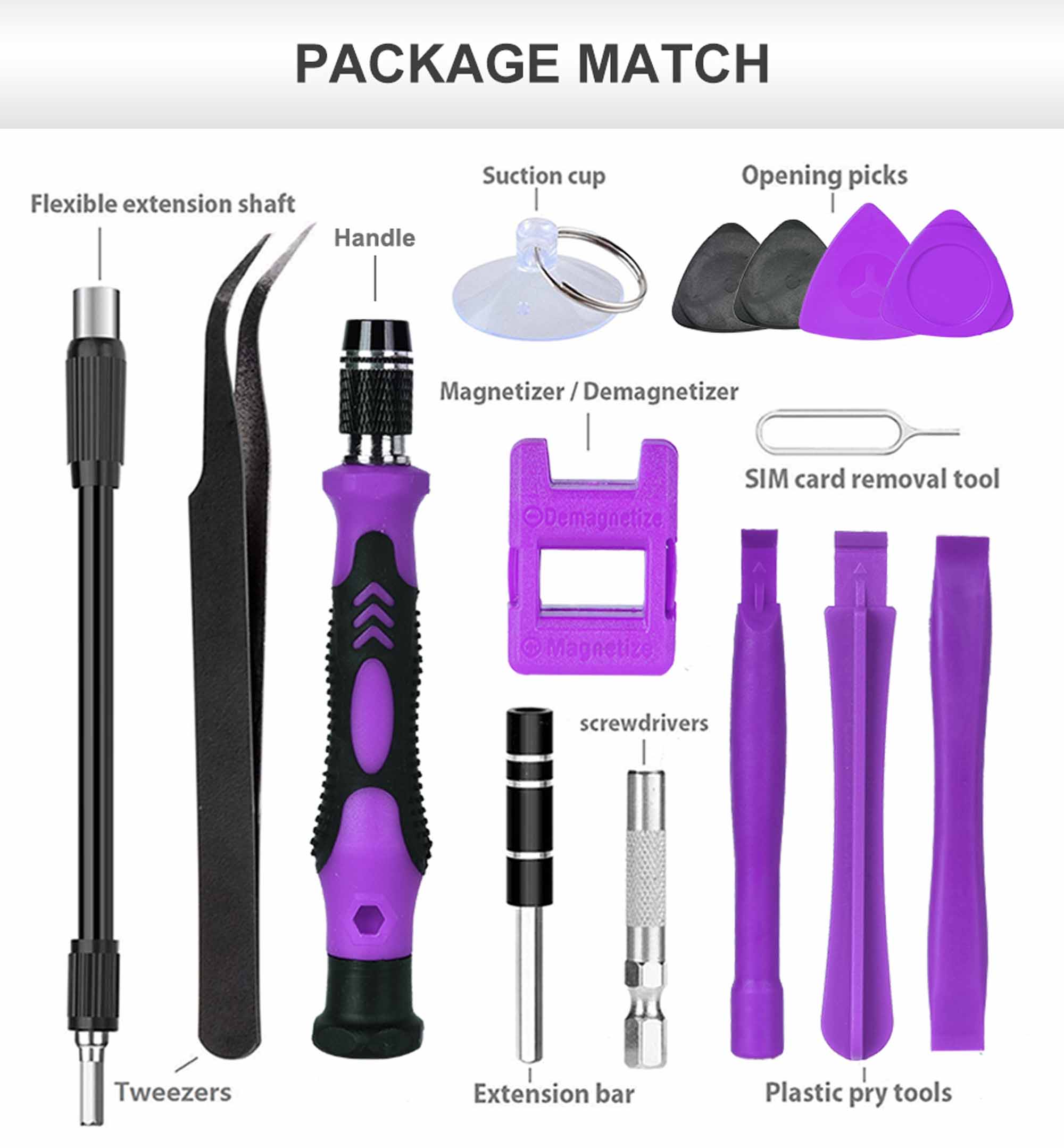 🔧 All-in-one design:Precision screwdriver set include 115 pieces, Including 98 x screwdriver bits, 1x plastic retractable handle + 1 extension bar set, 1 x flexible extension bar, 1 x tweezers, 1 x Hexagonal sleeve, 3x plastic pry tools, 1 x SIM card removal tool+1 x suction cup set, 8 x triangle pry tools,1 x Magnetization