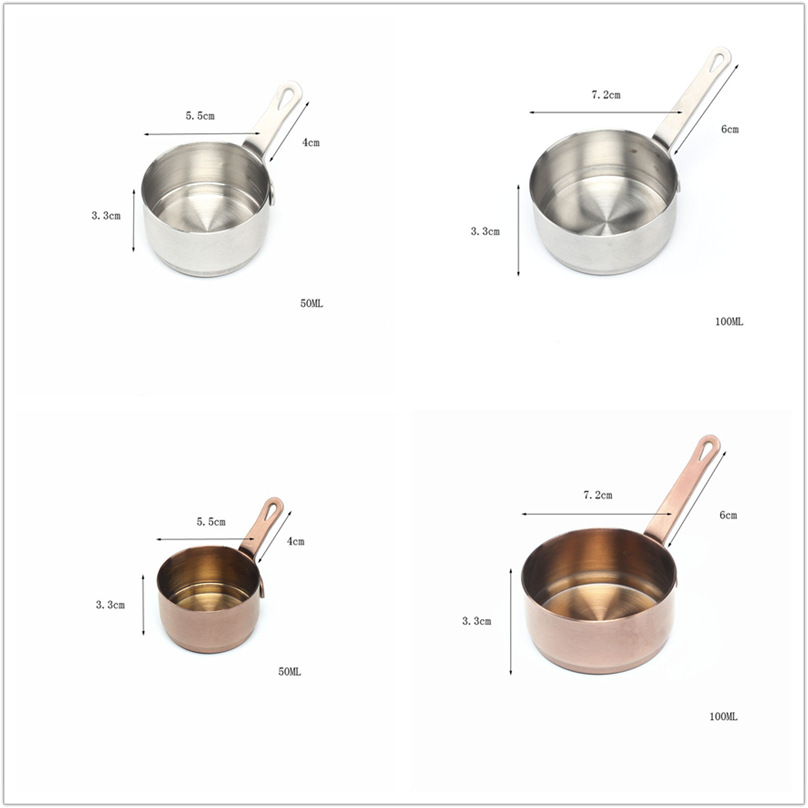 Description: Made from high quality stainless steel, exquisite workmanship. This stainless steel milk pot easily pour out the milk or porridge or sauce soup Long handle makes easy to hold; convenient mini sauce pan With a hanging hole, easy to store; safe on stoves cooker Prefect for warming milk, cooking porridge noodles for baby, making coffee, butter, making sauce for your steak and so on. Specification: Material: Stainless Steel Color: Rose gold,Silver Capacity: 50ml, 100ml Size Chart: 50ml Size: Approx. 5.5x3.3cm/2.17x1.30inch, Handle 4cm/1.57inch 100ml Size: Approx. 7.2x3.3cm/2.83x1.30inch, Handle 6cm/2.36inch Package Includes: 1pc or 2pcs(50ml+100ml)