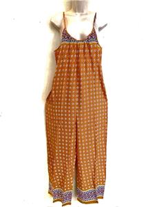 Artsy clothing for creative people who aren't afraid to show a little color! 100% Rayon ethnic India print jumpsuit. This jumpsuit has 2 side pockets and adjustable straps. This is a one piece garment that you step into. No buttons or zippers. If you do not wear a tee shirt under it, you probably could not get away with wearing a bra with this garment. The model is just to show how the item fits, but the pattern in the separate photos are the ones you will receive. Check the measurements below.