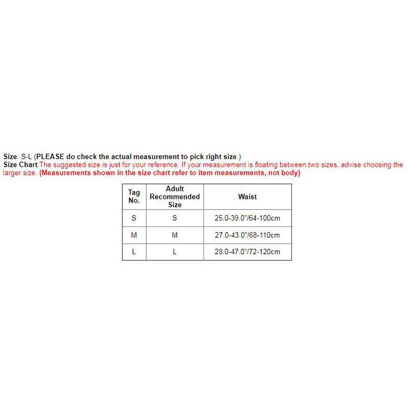 Tag No.Adult Recommended SizeWaistMM24.5-36.0"/62-92cmLL27.0-38.5"/68-98cmXLXL29.0-41.0"/74-104cmFriendly Tips: The size is measured by hands, please allow minor error of measurement. Photo color might be a little different from the actual product due to color display of different monitors.