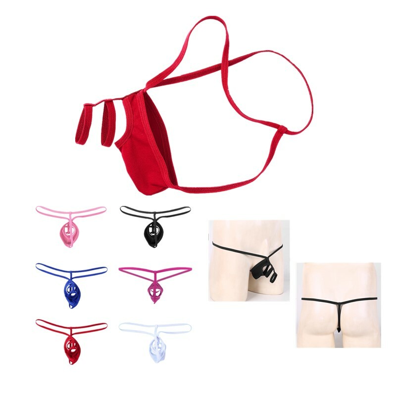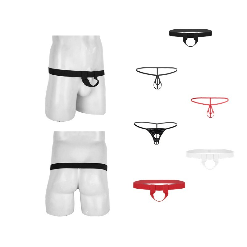 Wide comfy elastic waistband, front with metal penis rings, open back design.