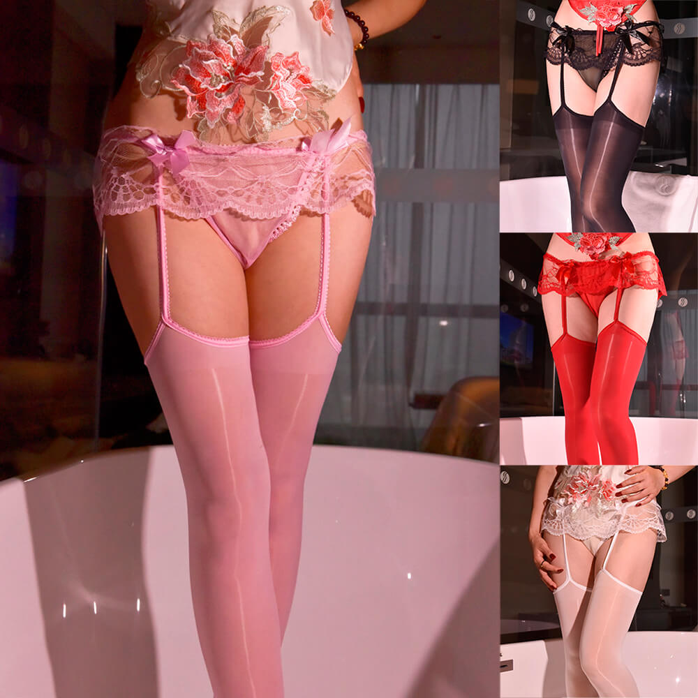 Lace Garter Belts G-string Lingerie Nylon Shiny Thigh-Highs Stockings Pantyhose