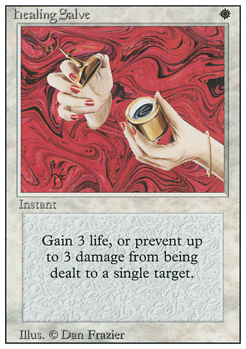 | | Name: | Healing Salve | | Set: | Revised Edition | | Number: | 22 | | Condition: | Near Mint or better | | Language: | English | | Variation: | Non-Foil | |
