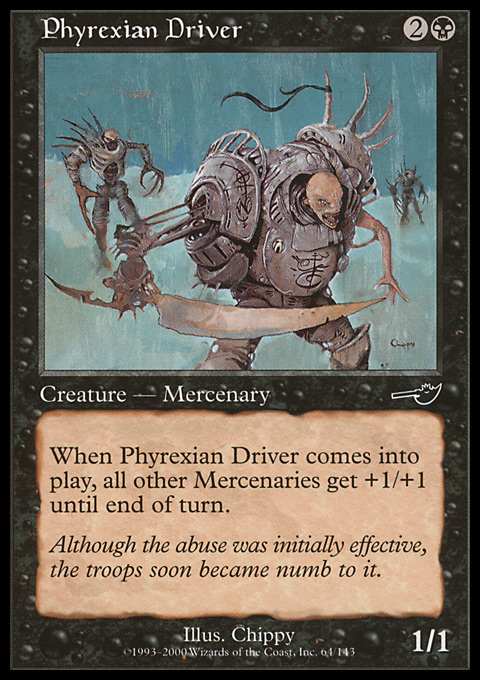 | | Name: | Phyrexian Driver | | Set: | Nemesis | | Number: | 64 | | Condition: | Light Play | | Language: | English | | Variation: | Non-Foil | |