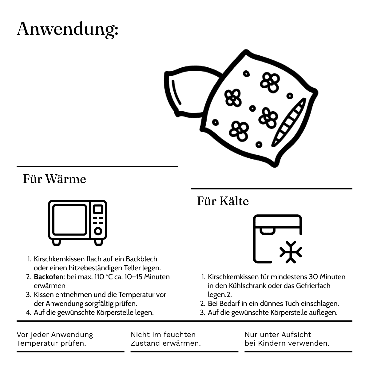 Durch Erwärmung im Backofen (Erwärmen Sie das Kissen einfach in dem auf maximal 110 °C vorgeheizten Backofen für ca. 15min und spüren Sie die entspannende Wirkung der Kirschkerne.) wird das Kirschkernkissen zu einer angenehmen Wärmequelle, die gezielt aufgelegt werden kann.