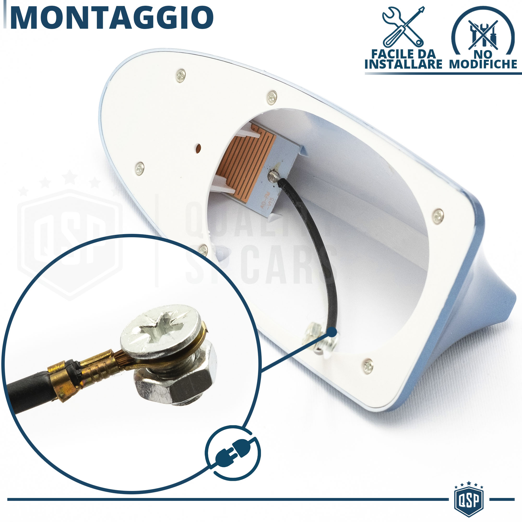 - Avvitare il cavo dell' antenna Pinna Squalo per mezzo dei due bulloni forniti in dotazione, dove era posizionata l' Antenna classica.