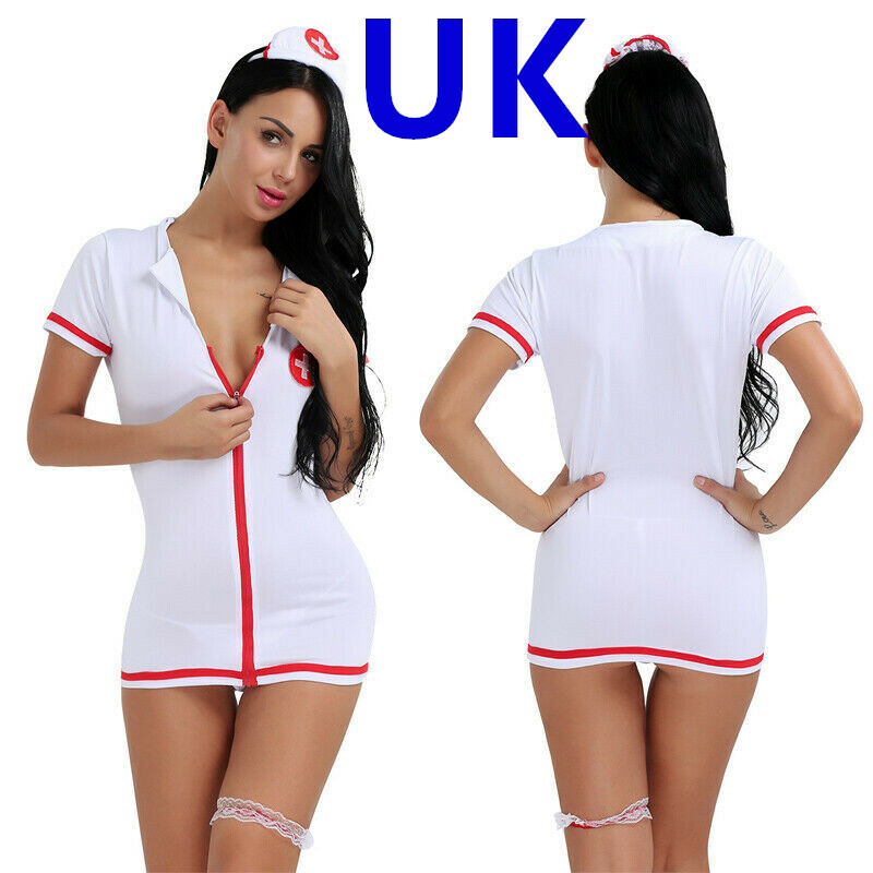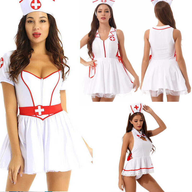 Women adults naughty nurse costume role play Halloween party outfit, flattering and attractive.