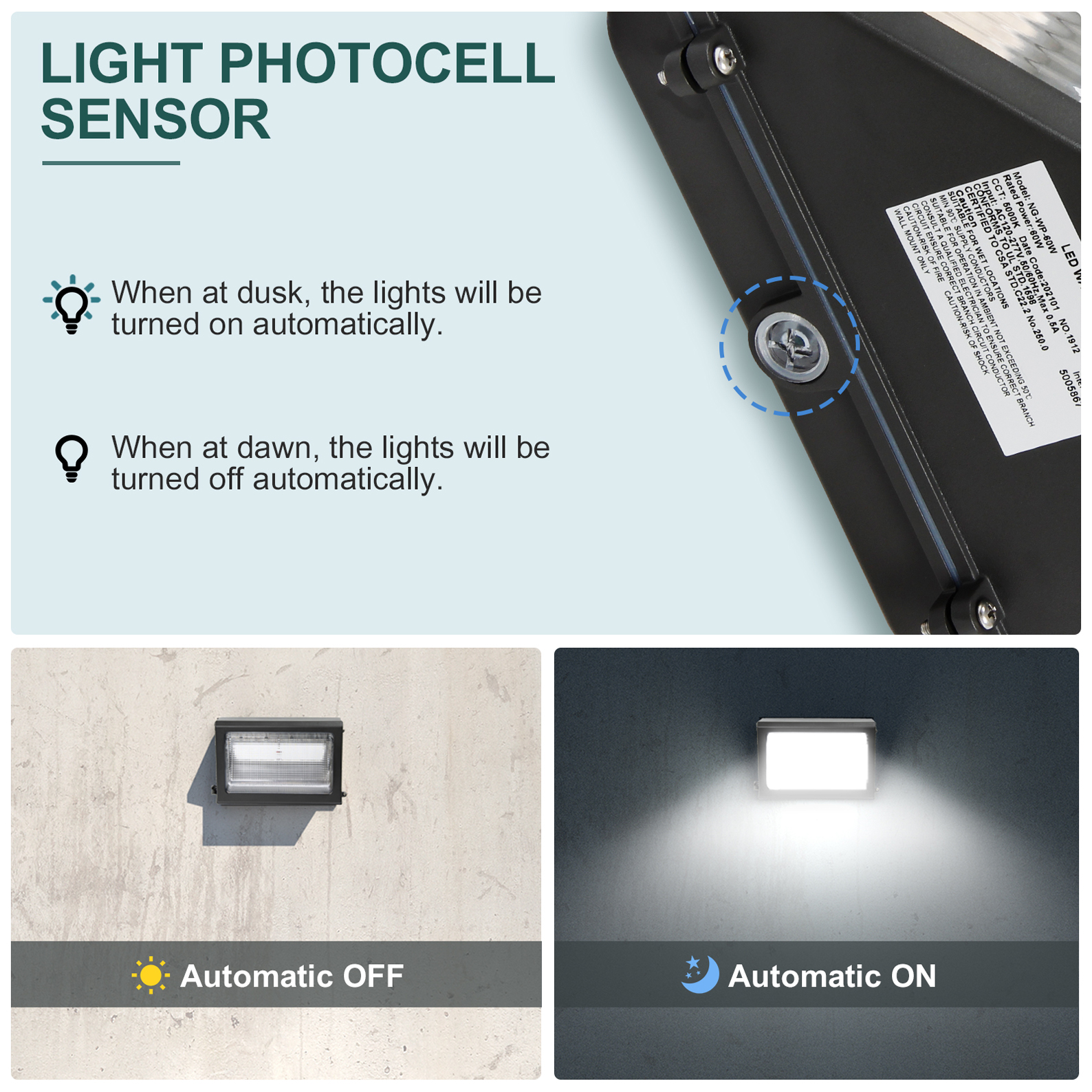 【PHOTOCELL SENSOR】The commercial outdoor security light is engineered with photocell technology, making this fixture a dusk to dawn outdoor light; The Photocell sensor automatically turns ON at sunset and OFF at sunrise, helping commercial businesses and residential homeowners save up to 80% on their energy bills, in comparison to metal halide lamps
