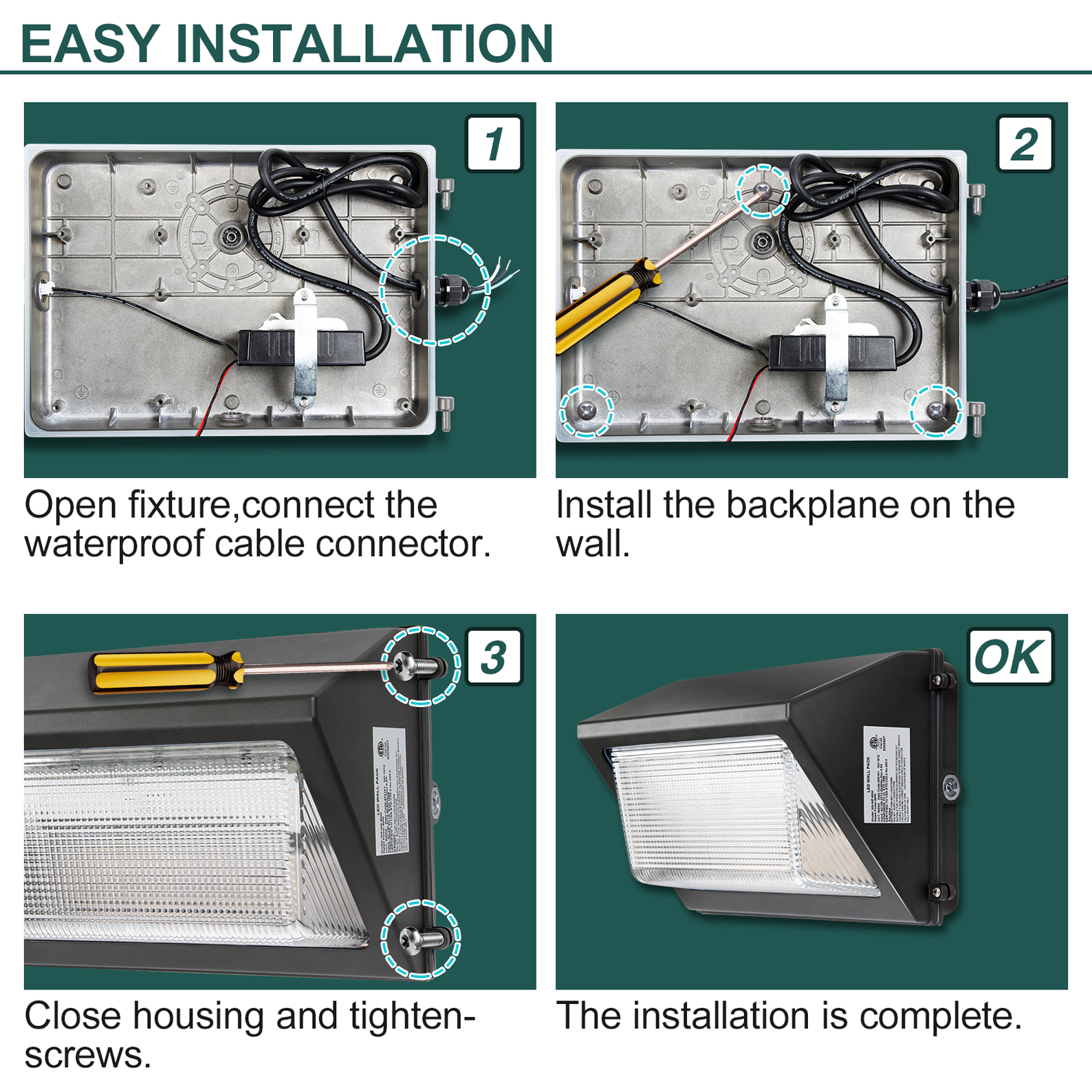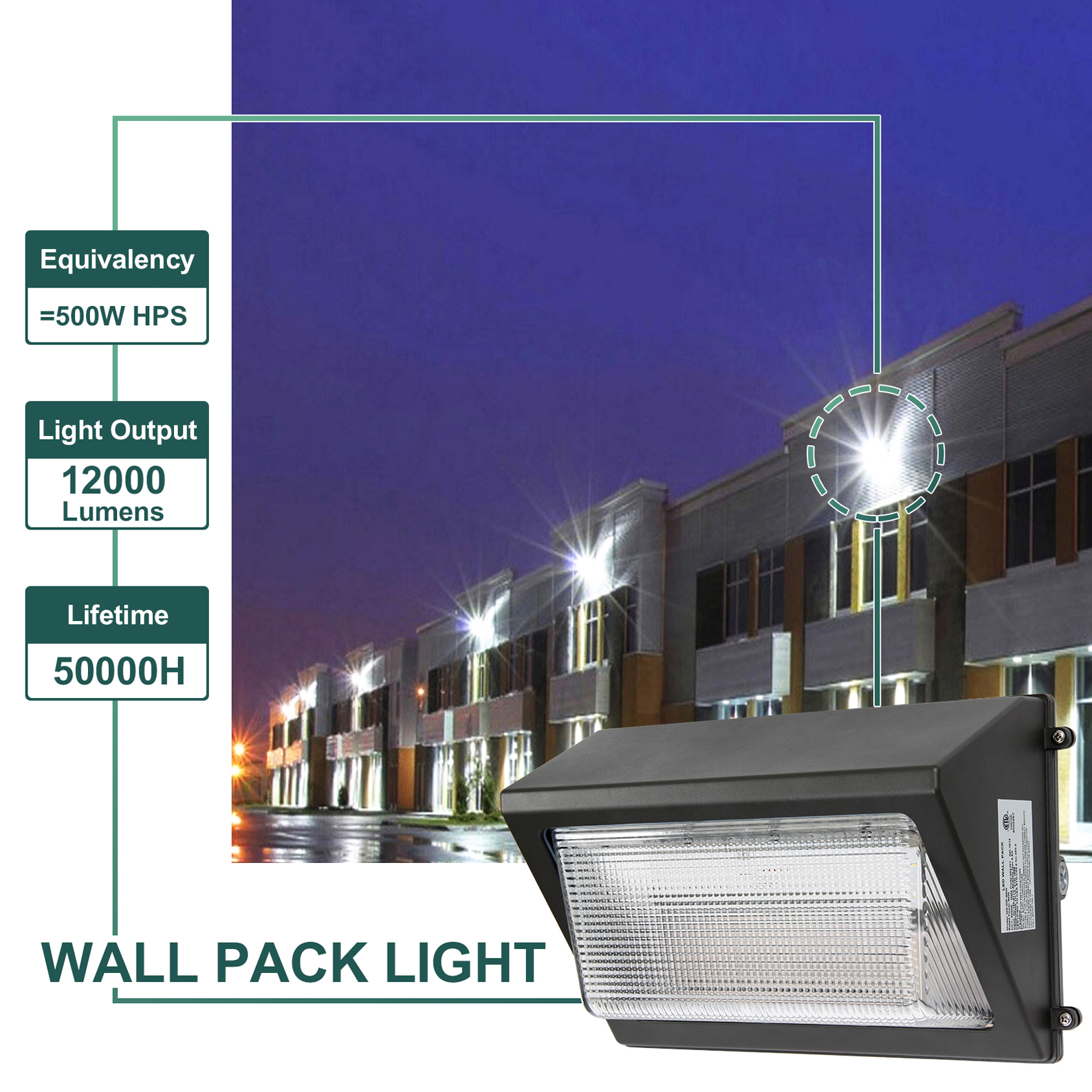 【IP65 WATERPROOF】The weatherproof rating ensures our LED wall pack can stand up to the elements; The durable aluminum housing means the wall pack is shock and shatter resistant to provide you reliable bright light in any weather 【EASY TO INSTALL】LED Wall Pack Light Fixture with Housing-box on the surface, you can easily install it to enhance the security; ETL and DLC listed.Lifetime is 50,000 hours, which means if it works 8 hours per day, it can work more than 17 years 【WIDELY USE】It is a suitable outdoor led light used widely for buildings and outdoor areas, such as school, building exteriors, parking lots, commercial outdoor spaces, street, etc.Suggest for mounting heights from 12-19ft when you buy 120W wall pack lights 【5 YEAR WARRANTY】Should your product fail within the first 5 years from the date of purchase we will fulfill our promise and replace it free of charge to you; If you have any question of product, you can write the specific problem through E-mail, we will give you a reply within 24 hours