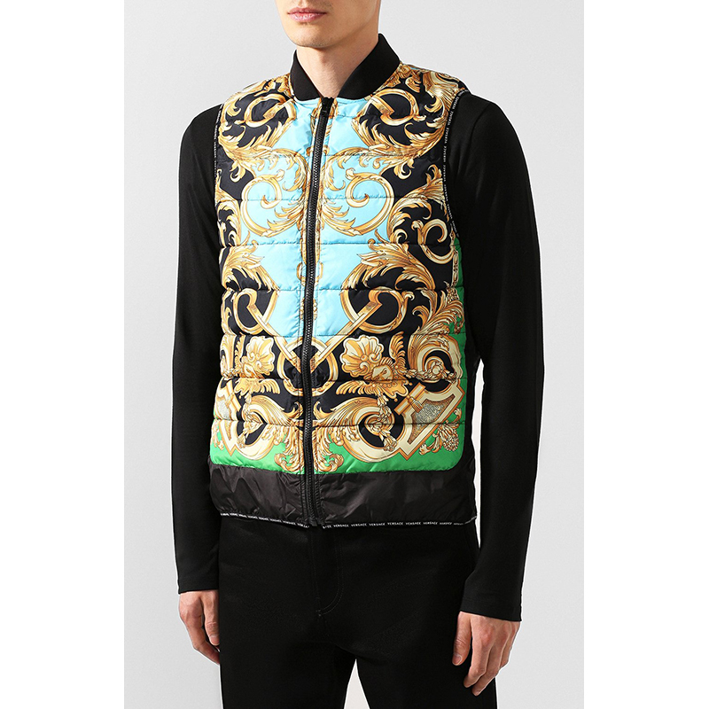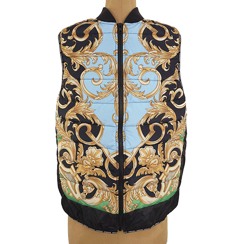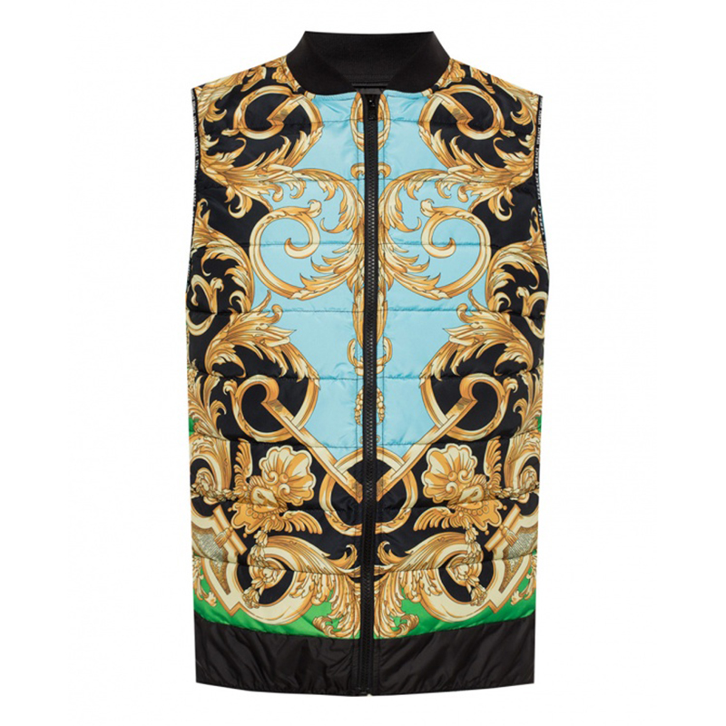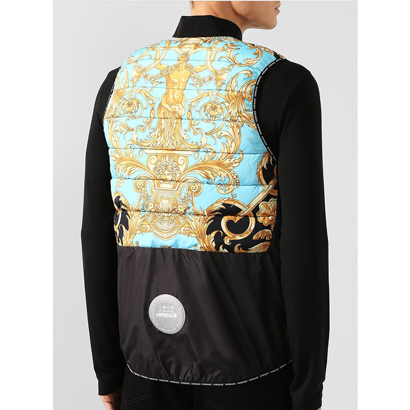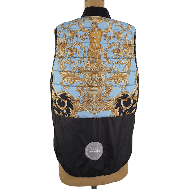 Authentic Versace vest in a sporty style. Baroque print in black and gold with blue and green. Quilted polyester. Front zip. Rin knit collar. Black nylon border in front and longer rounded shirttail hem in back with Versace logo ribbon trim. Gray reflective Medusa patch in back. 100% polyester, 100 nylon. Style AGU90005. Made in Italy. Sure to get noticed, very classic Versace with a sporty touch.