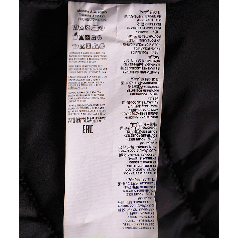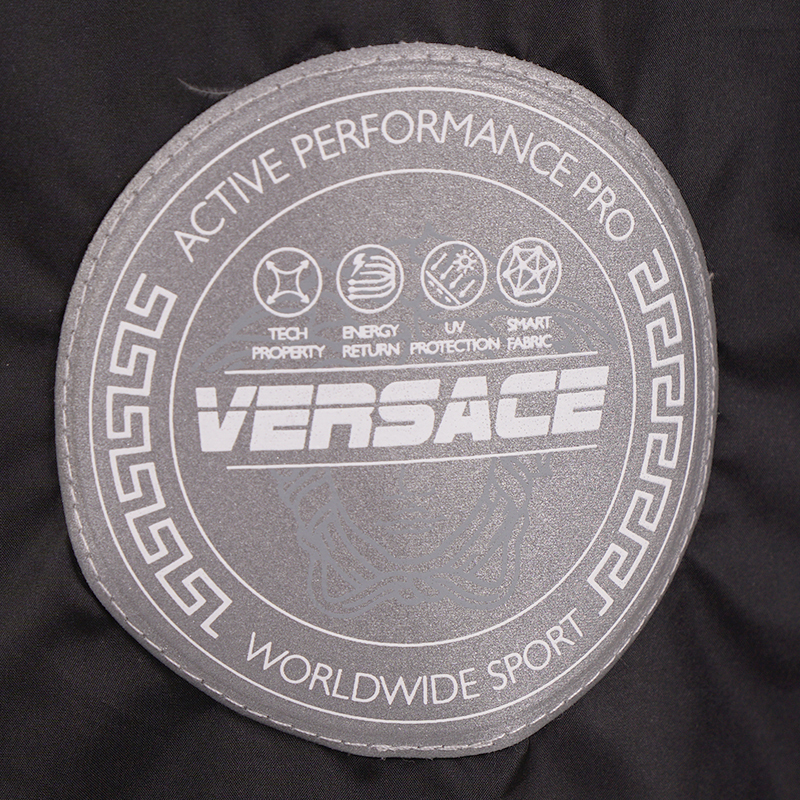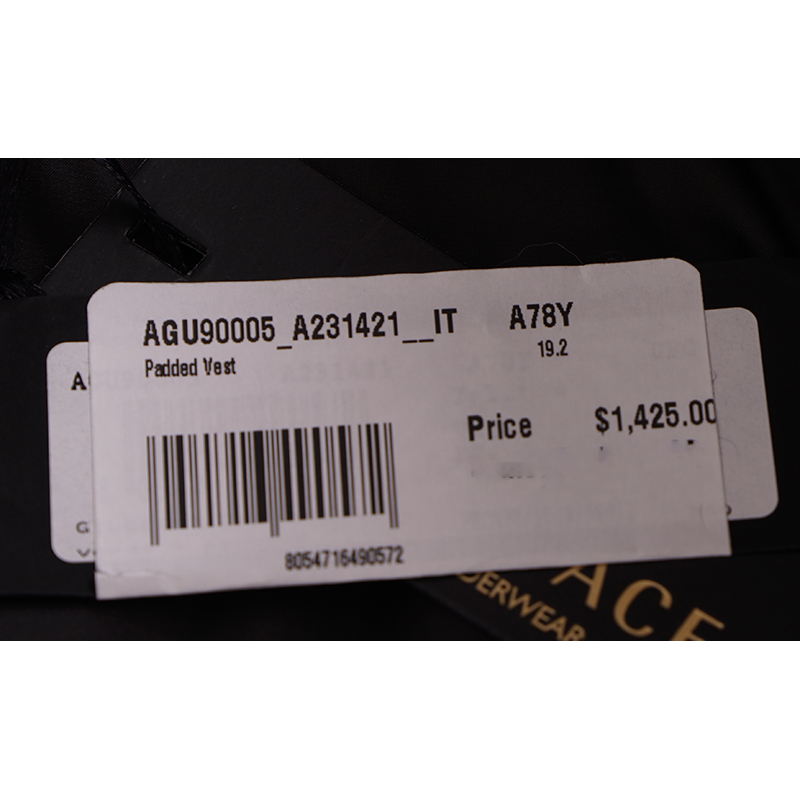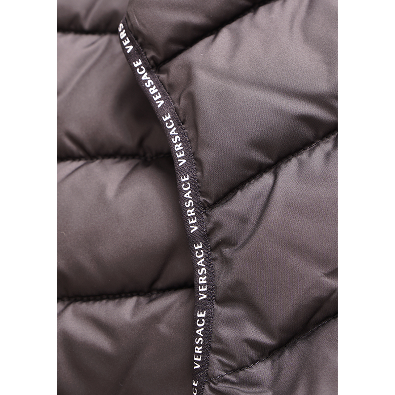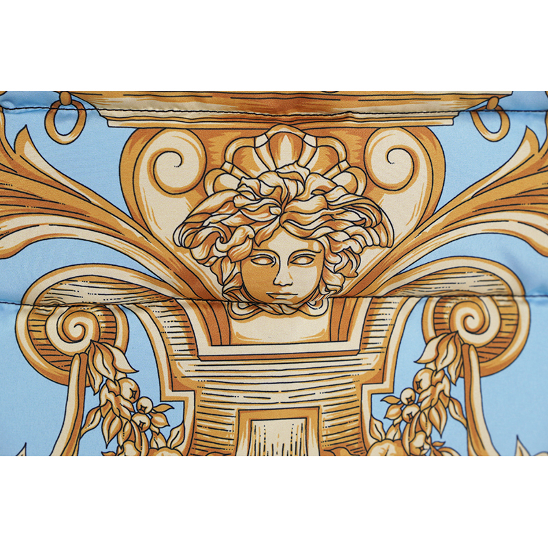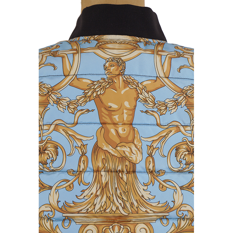 Authentic Versace vest in a sporty style. Baroque print in black and gold with blue and green. Quilted polyester. Front zip. Rin knit collar. Black nylon border in front and longer rounded shirttail hem in back with Versace logo ribbon trim. Gray reflective Medusa patch in back. 100% polyester, 100 nylon. Style AGU90005. Made in Italy. Sure to get noticed, very classic Versace with a sporty touch.