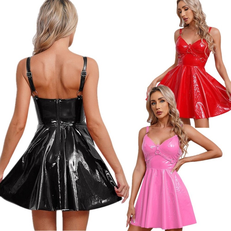 Ladies shinny patent leather mini dress, wet look appearance.
