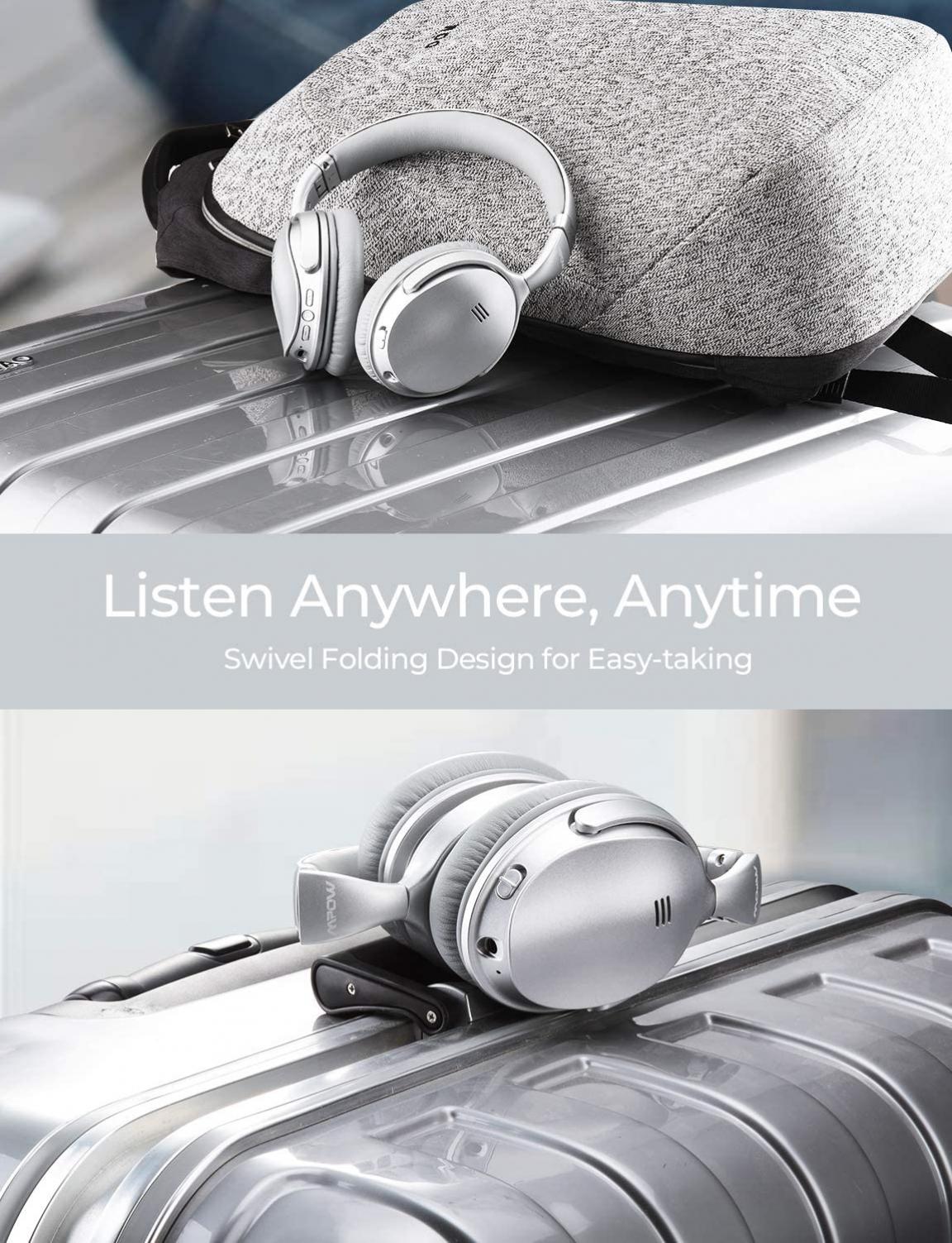 Wireless Headphones Over-the-Head Earphones Folding Hands-free Headset Microphone Noice Canceling. Active Noise Cancelling Bluetooth Headphones adopt Active Noise Cancelling Technology to create a quiet listening space for you on the journey, make you freely enjoy the music, watch the movie on the plane/bus/railway, giving you a pleasant journey. Advanced active noise cancelling technology effectively reduces low-frequency noises. 40mm large-aperture drivers give you crisp, powerful sound with deep bass. Comfortable around-ear ear cushions for all-day wear. Up to 20 hours music/talking with a single charge. Built-in CVC 6.0 microphone for hands-free call. Thanks to the Wireless technology, you can stream your music from smartphones, tablets, TVs and other Bluetooth enabled music devices within 33ft. Note: you need a SEPARATE transmitter when connected with TV.