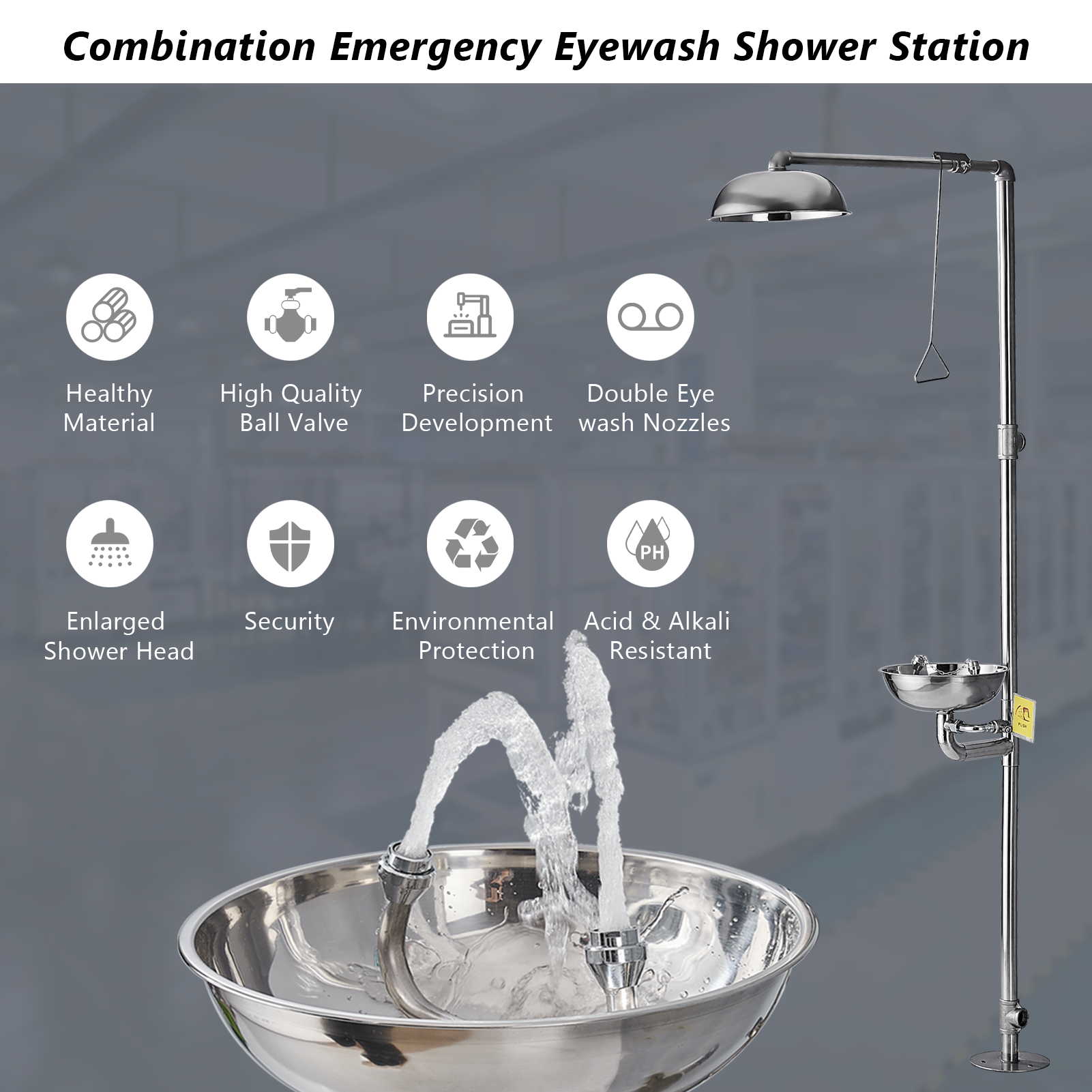 This combination of eyewash and shower stations is made of durable 304 stainless steel material with ABS coating, no harmful substances precipitated. It is used to give cleaning to eyes, face, and body at any time in order to minimize damage and harm when exposed to harmful chemicals.