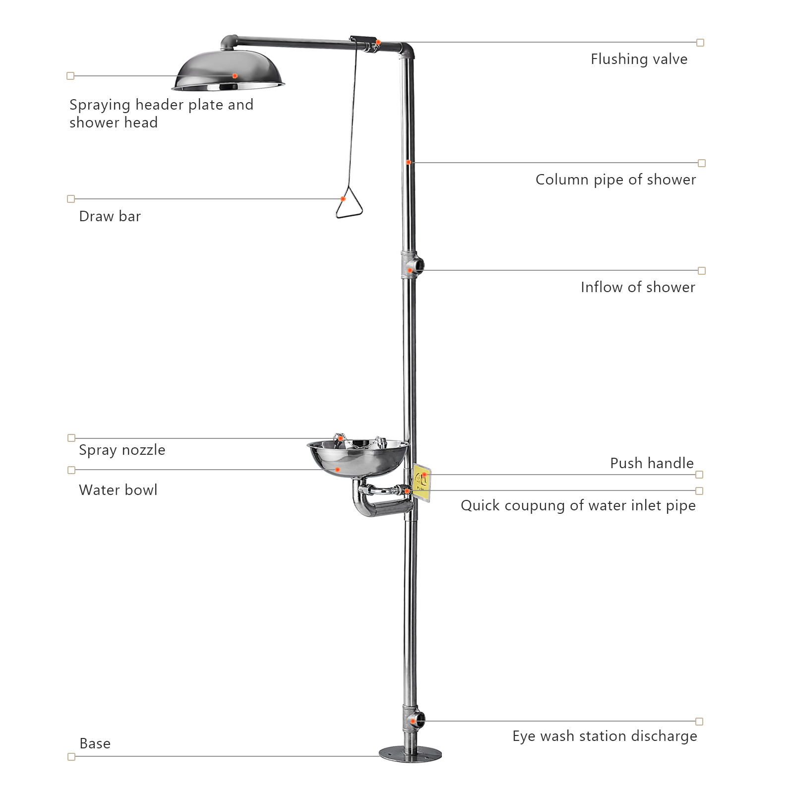 【DOUBLE AERATED HEADS】This combination station for eyewash and shower is designed with an eyewash bowl with dual eyewash nozzles to gives eyes a clean and an enlarged shower spray with a pull rod switch to take a quick shower.