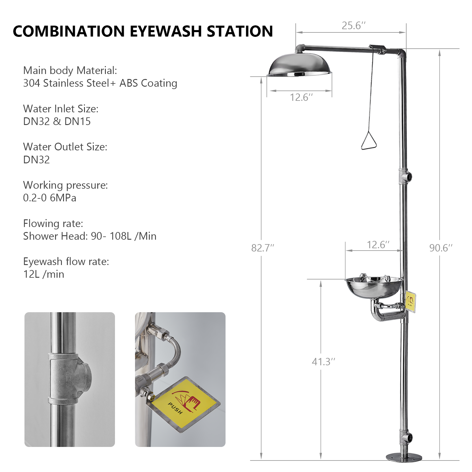 【COMBINATION & EASY INSTALLATION】The station can be mounted on the ground to give an emergency eyewash solution. Assembly and installation are easy with no fatigue. Water inlet interface dimensions: DN32; Outlet interface dimension: DN32.