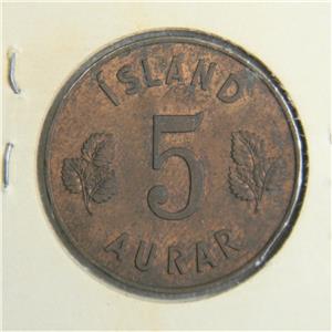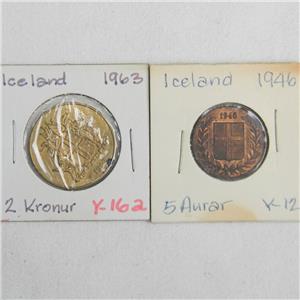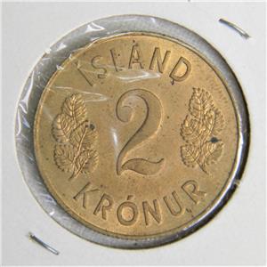 Iceland Republic coinage - 2 coins in this lot. 5 Aurar is made of bronze alloy, plain rim. 2 Kronur is made of nickel-brass alloy, reeded rim (28 mm in diameter). Not cleaned with attractive original patina; t hese are the actual photos. FREE SHIPPING within the US for this item.
