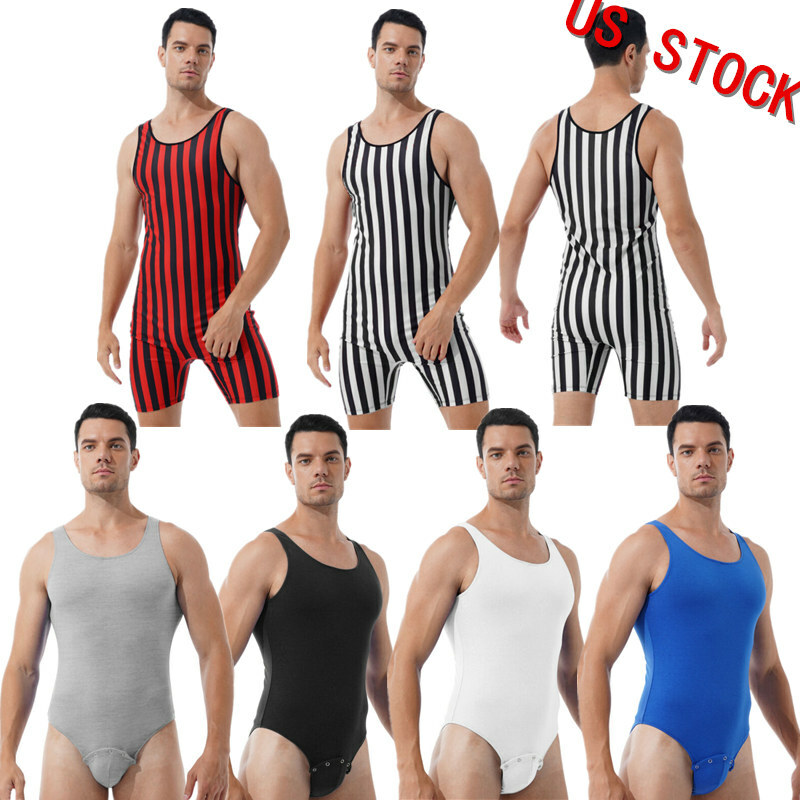 Men Striped Wrestling Singlet Bodysuit Stretchy Leotard Athletic Jumpsuit.