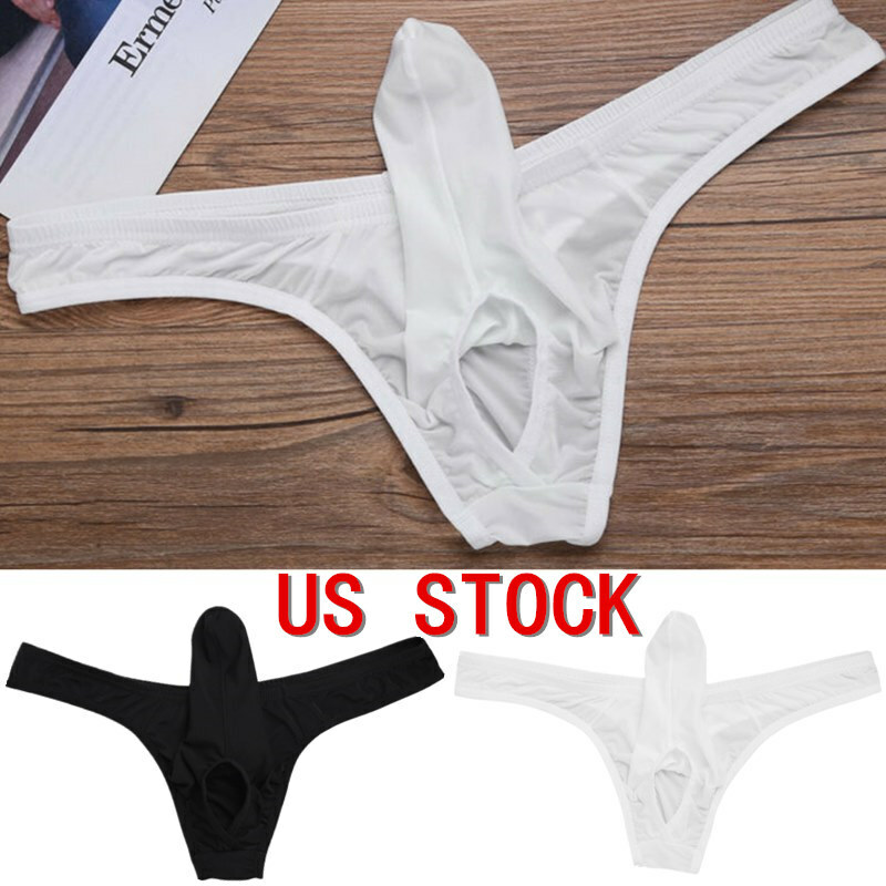 Men’s shiny bikini thong briefs underwear, pull on closure.