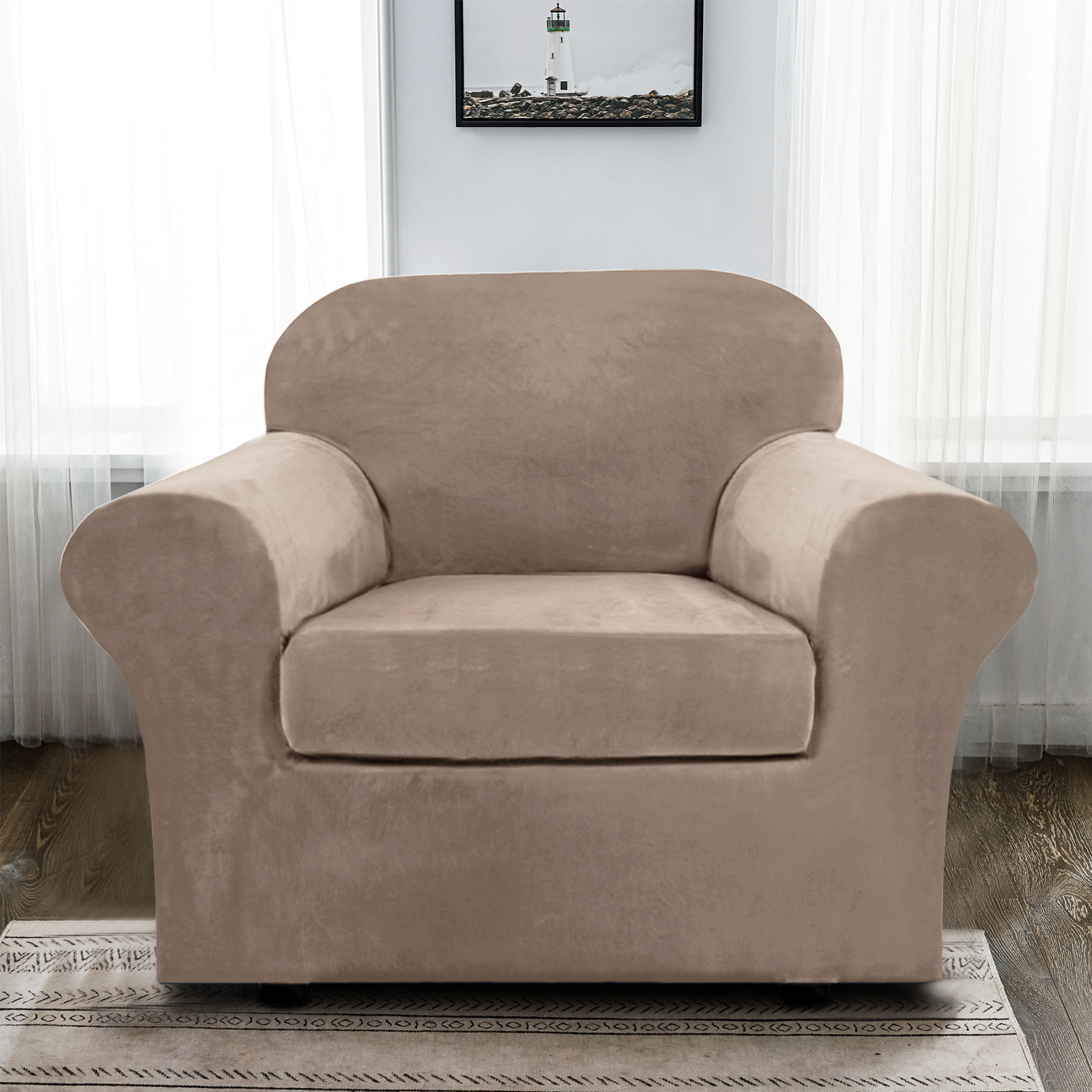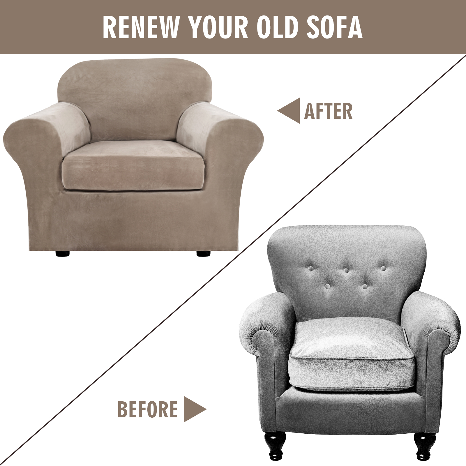 【GREAT FIT】This innovated 2 Piece couch cover is crafted from luxurious velvet plush fabric, including 1 piece of base cover and 1 piece of cushion cover. Chair slipcovers kindly measure before ordering