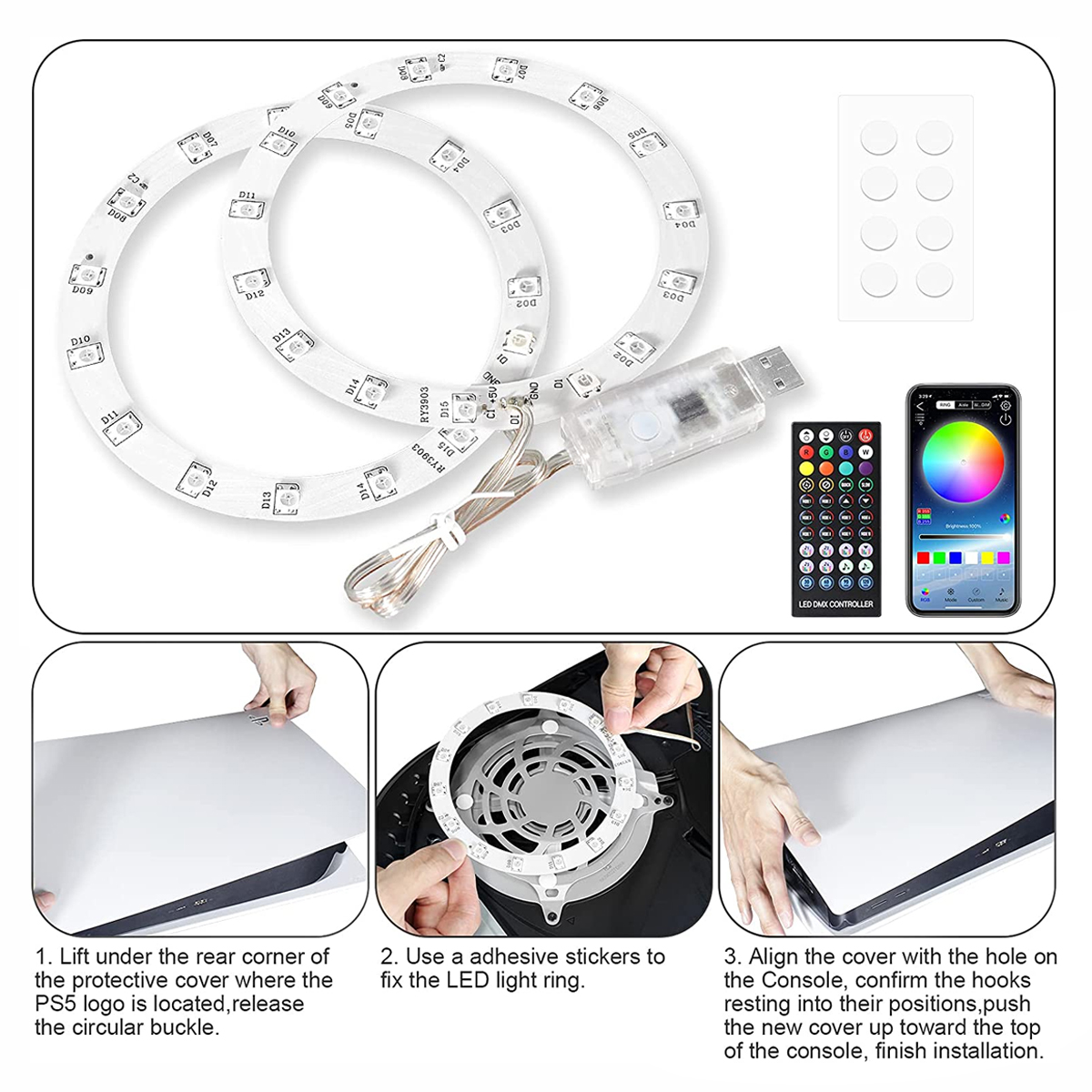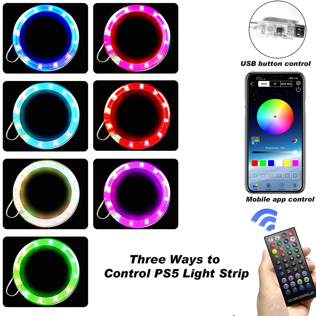 💝3 Control Methods: The APP mode can customize the light, brightness, and speed of the PS5 LED light according to your preferences. IR remote accepts a wide range of signals, no matter where you are, you can control and adjust the PS5 light kit. The USB switch control method can effectively control the LED light for PS5, long press to turn on and off the PS5 LED light, short press to change the light, simple, convenient, and easy to operate.