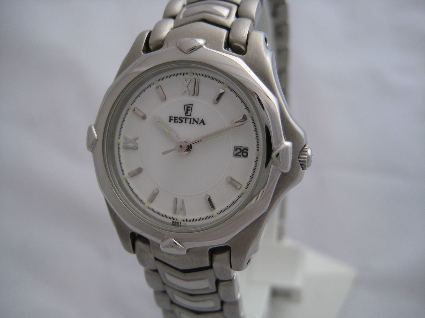 Noswatch Condition: New with box Movement: Quartz Metal color: combined mat and shiny silver color Dial Color: white Strap Color: combined mat and shiny silver color Width (3-9 o'clock / w/o crown): 26mm Width (12-6 o'clock): 26mm Other details: Festina is a well known Spain company for high quality watches. ref 9801, all stainless steel, water resistant 50 meters, with date and seconds, back and lock signed by Festina, with original Festina box. The back is lightly scratched.