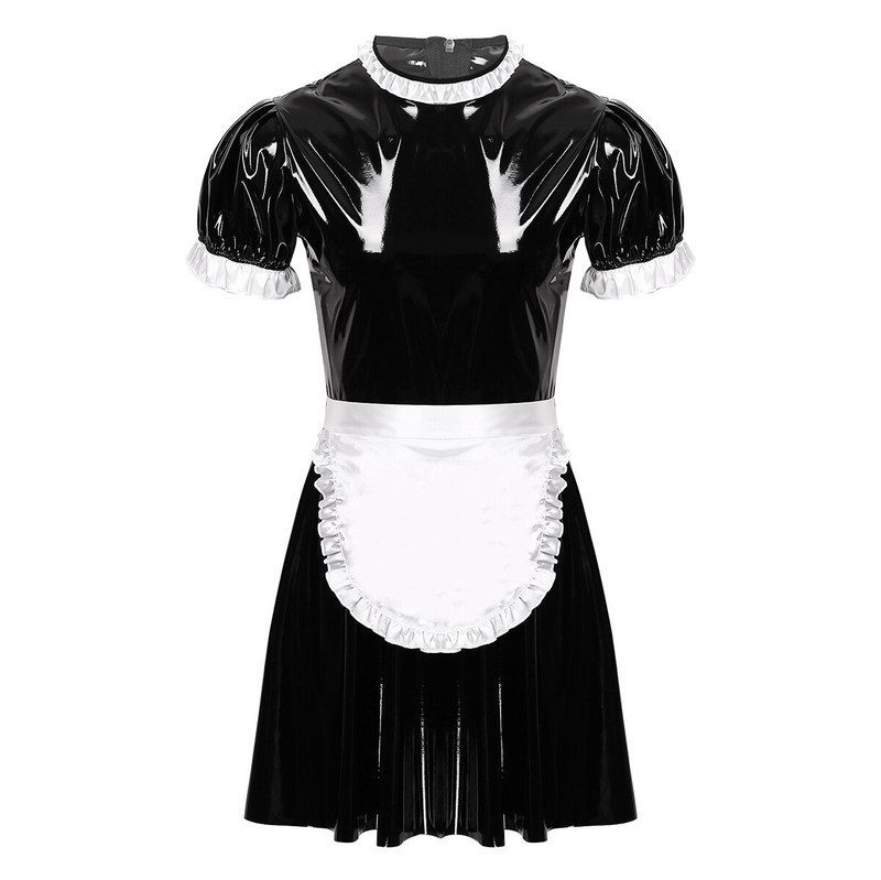 Men’s sissy wet look maid servant uniform cosplay costume dress with apron set, concealed back zipper closure.