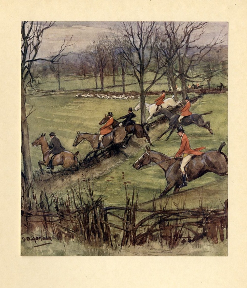 This genuine antique color print/plate is titled "NEARLY ABREAST O' THE PACK, WE SEE SIX MEN GOIN GALLANTLY, AND QUITE AS STRAIGHT AS THE 'OUNDS THEMSELVES", by G. DENHOLM ARMOUR, published in the rare "Mr. Jorrocks Lectors" 1910.