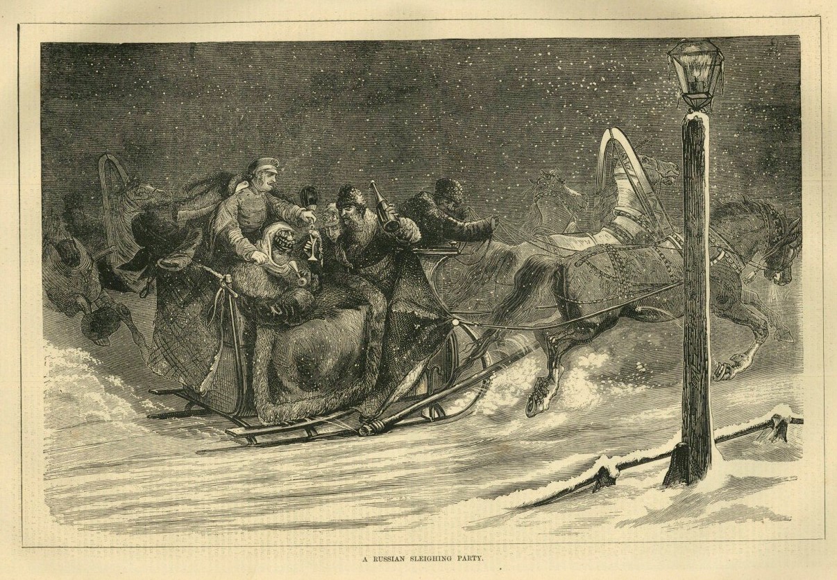 This genuine antique wood-cut engraving is titled "A RUSSIAN SLEIGHING PARTY", published in the rare "The Illustrated Sporting and Dramatic News" January 1876. This dated engraving from the year of 1876 is 10 x 14 inches in size with wide margins. It is in excellent condition, highly displayable and ready for framing and is guaranteed to be as described. I do not deal in copies/reproductions. The lines you may see in some of the older engravings are from the adjoining of woodblocks to create the complete image. In order to speed up the process of wood-cut engravings, several artists carved a section of the block of wood then the blocks were adjoined, stamped in ink then onto this page. Also occasional spots or foxing are usual for these older engravings. They do not detract from the value or splendor of the engraving but only attest to it's authenticity!